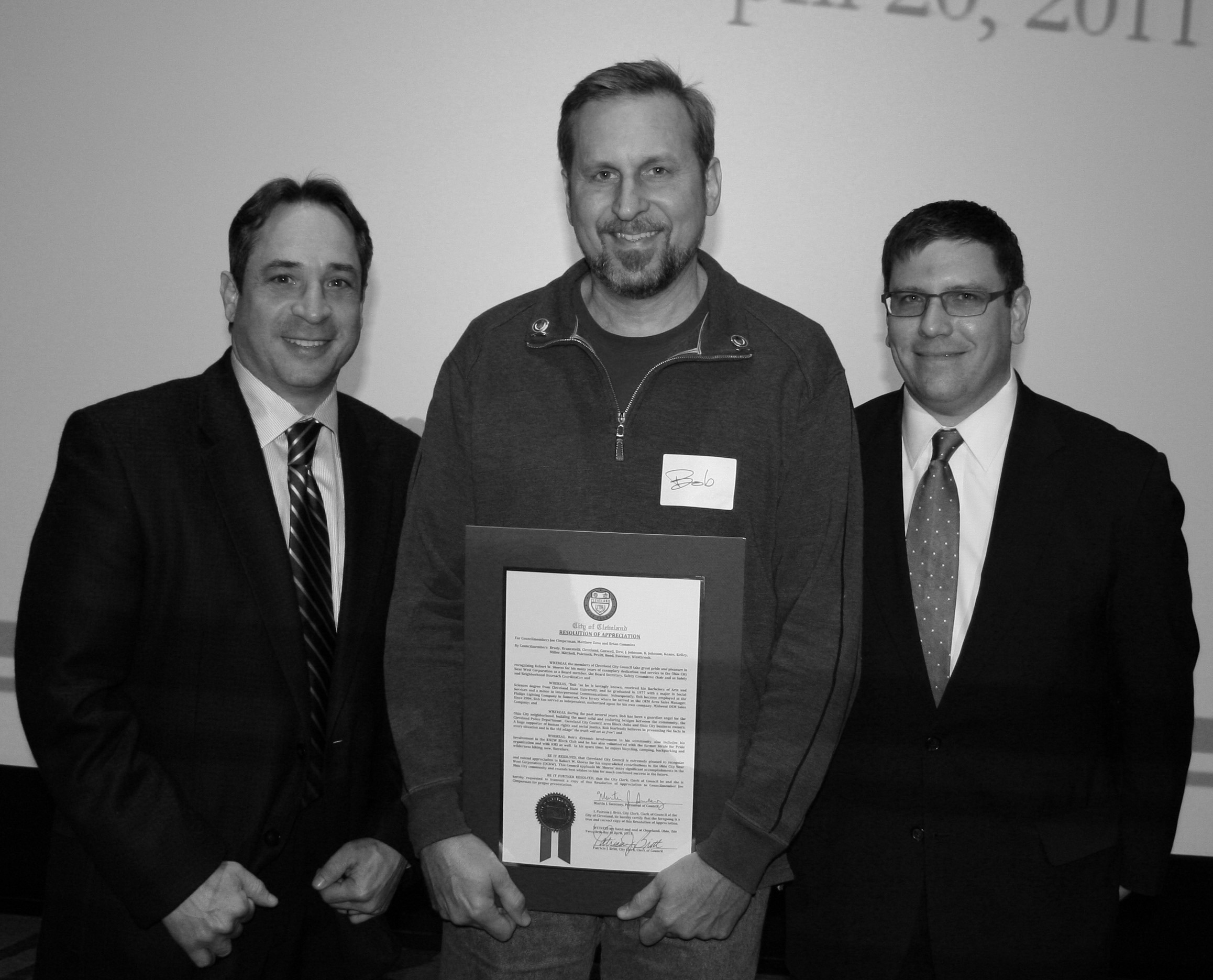 PHOTO BY CHUCK HOVEN Wednesday, April 20, 2011; Ohio City Annual Meeting, Saint Ignatius High School Breen Center, W. 30th & Lorain Ave: ((L-R): Ward 15 Councilman Matt Zone, Bob Shores, Ward 3 Councilman Joe Cimperman. The councilmen recognize Bob Shores for his many years of service as Ohio City’s Safety and Outreach Coordinator.