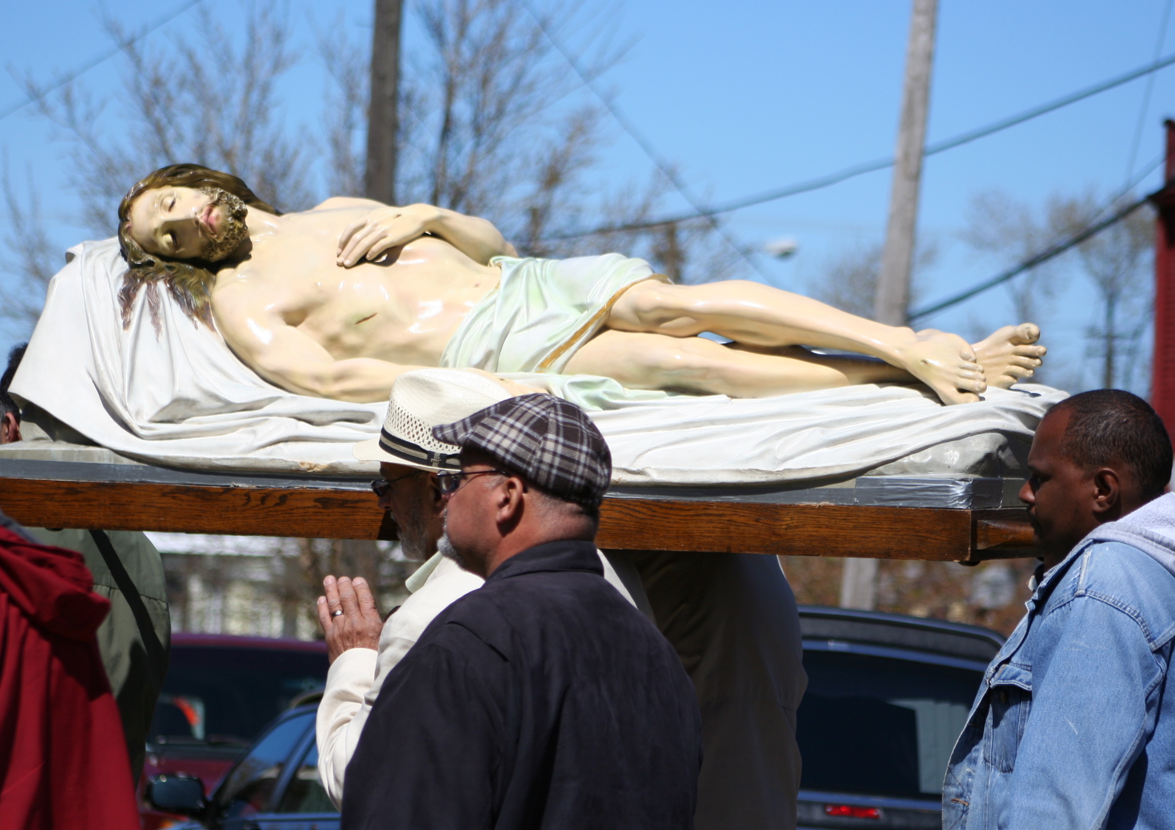 Friday, April 6, 2012, Good Friday Procession arrives at La Sagrada Familia Catholic Church at 7719 Detroit Avenue. The procession began at noon at St. Michael’s Church on Scranton, stopped at St. Patrick’s on Bridge Avenue at 1 p.m. for a Passion reading, moved to W. 65th and Bridge where members of St. Colman Church joined the procession on its way to La Sagrada Familia for Adoration of the Cross and Communion.