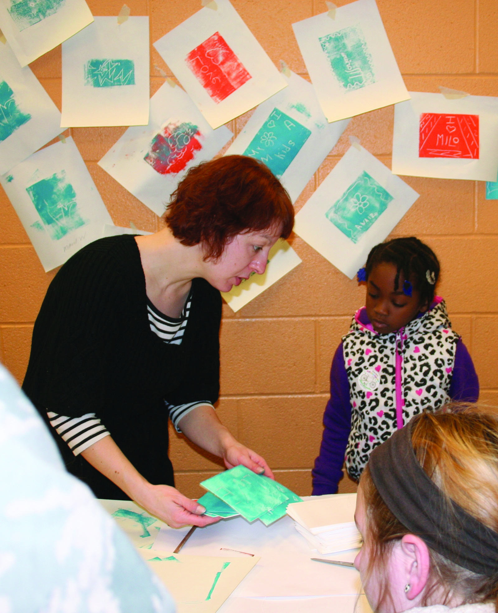 Wednesday, January 22, 2014, West Park Youth Activities Fair, Artemus Ward School, 4315 W. 140th Street: Stephanie Kluk of Art House shows some artwork samples to Mikael White, age 4.