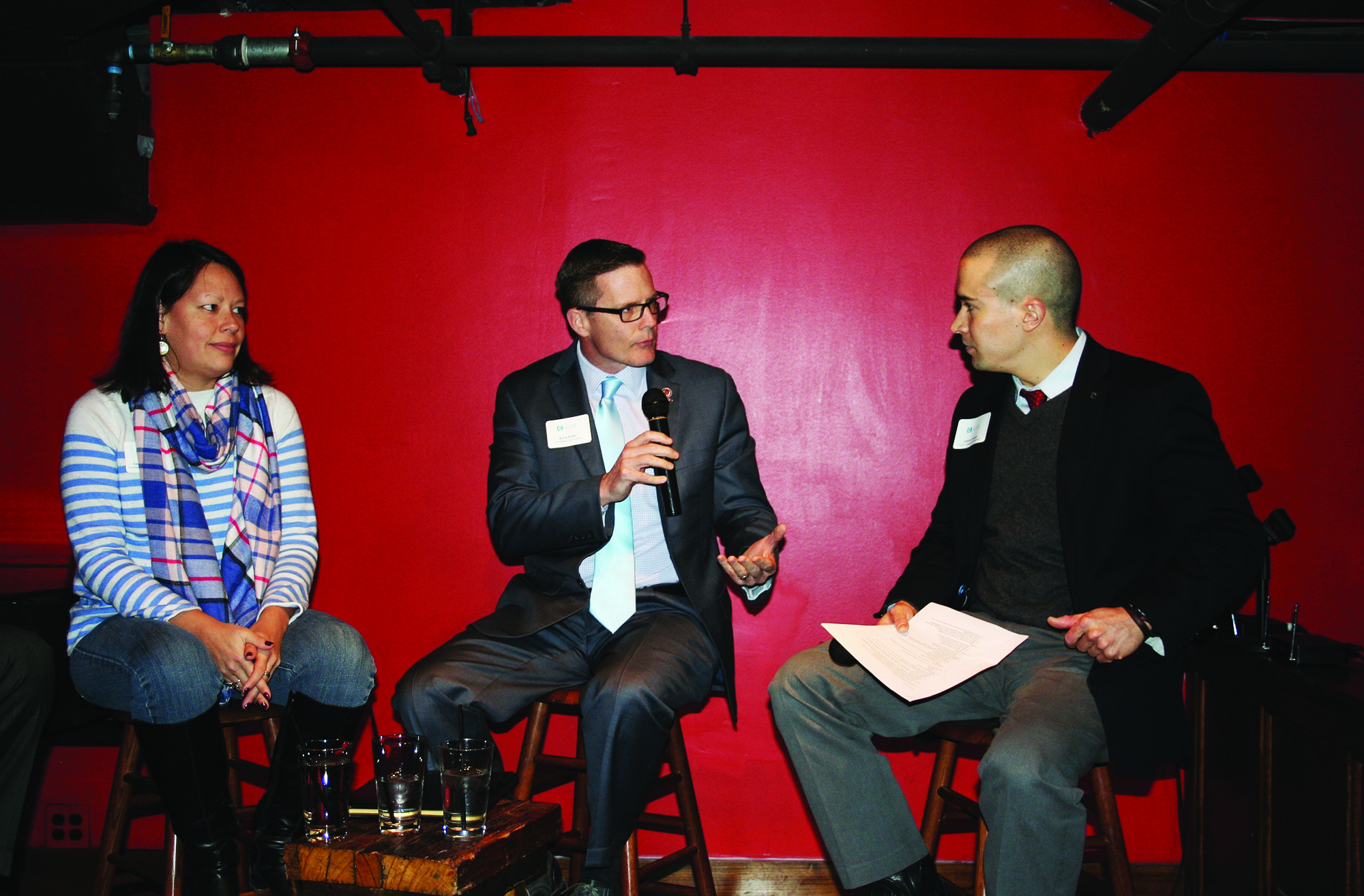 (Top Photo) Wednesday, January 22, 2014, Civic Commons at the Bier Markt, 1948 W. 25th Street, Conversation about Cleveland and Cuyahoga County Budgets: (L-R) Cleveland Tenants Organization Executive Director Angela Shuckahosee, Cleveland City Council President Kevin Kelley, and Civic Commons Ideastream’s Andrew Samtoy.