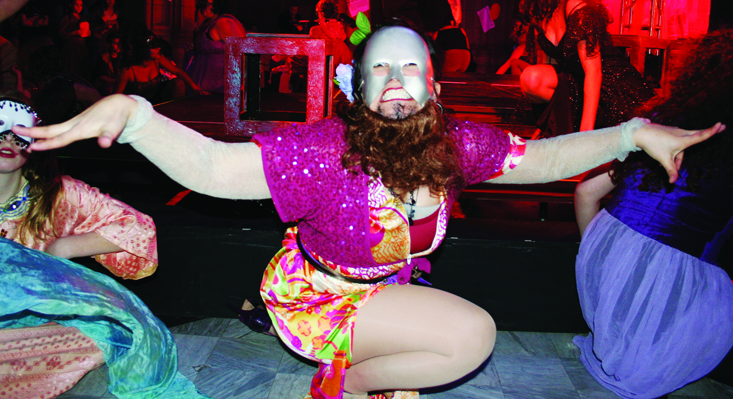 Saturday, February 15, 2014; Near West Theatre Benefit, Love Makes the World Go ‘Round, Trinity Cathedral, 2230 Euclid Avenue: Near West Theatre performers, costumed as “freaks” in a performance that asks the question “Will you love me, as I am?” Here actor Christene Pantalone plays the role of a “freak”, as actors examine the treatment by society of those that are different.