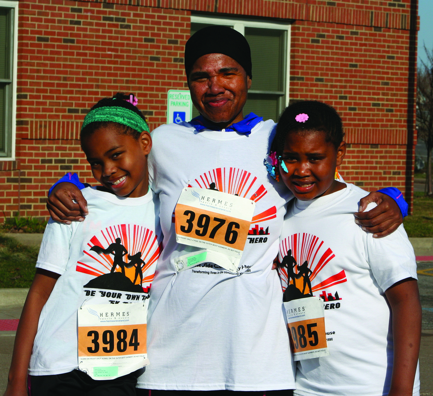 Saturday, April 12, 2014; Be Your Own Hero 5KRace and 1 mile run, West Side Community House, W. 93rd and Lorain Avenue: Twins Rahaiila Kimolo, age 9, and Raiifa Kimolo, age 9, and Amina Abdulhaqq (center), a former West Side Community House Employee who now is a Social Worker with Catholic Charities Refugee Services. Rahaiila and Raiifa came in first and second in their age group in the one-mile run.