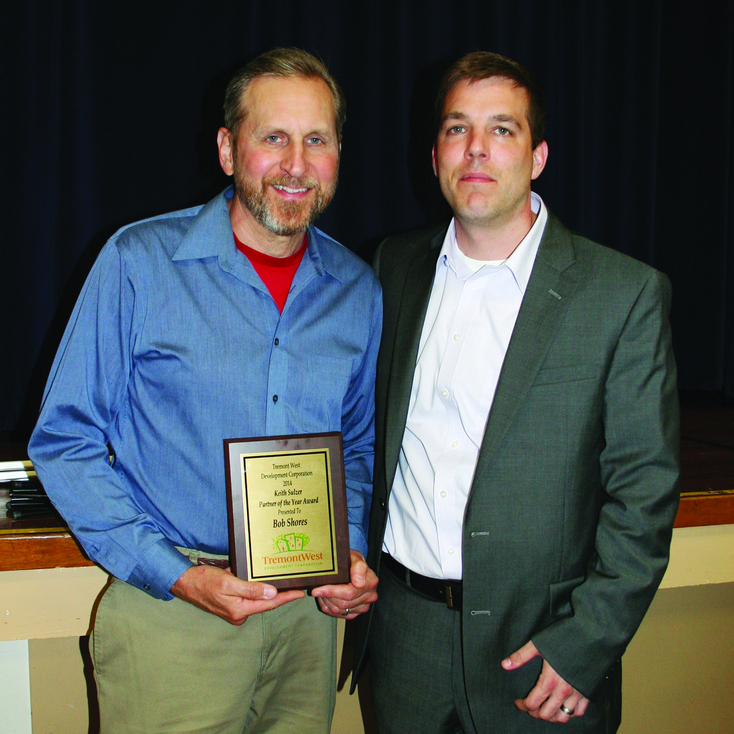 PHOTO BY CHUCK HOVEN Monday, May 19, 2014, Tremont West Development Corporation Annual Meeting, OLA St. Joseph Center, W. 14th and Kenilworth: Bob Shores receives the Keith Sulzer Partner of the Year Award from Tremont West Development Corporation Executive Director Cory Riordan. Shores serves as Co-Chair of the Second District Police Community Relations Committee. The new award was named in honor of former Second District Police Commander Keith Sulzer.