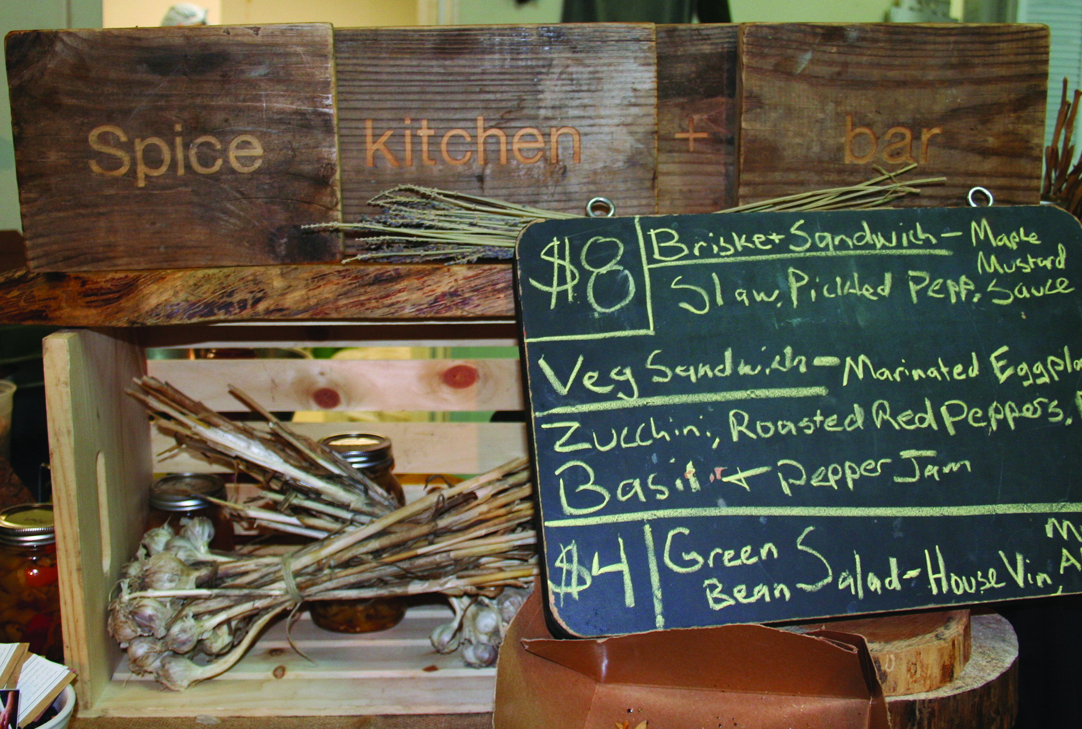Friday, June 13, 2014; Open House at 78th Street Studios, 1300 W. 78th Street: Spice, a local restaurant, offers a selection of items for lunch for guests touring artists’ studios during the Open House. Each Friday, some of artists at W. 78th Street Studios open their studios for the public to view. Artist Suzie Frazier designed the sign (Spice kitchen + bar) for the restaurant. Frazier has a studio near the lunch counter.