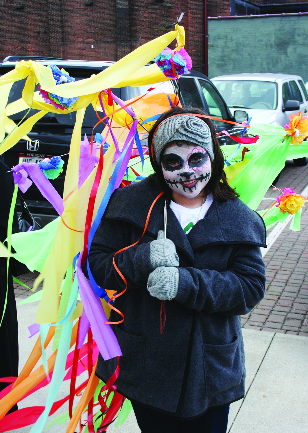 Saturday, November 1, 2014; Dia De Muertos (Day of the Dead) celebration, Cleveland Public Theatre Parish Hall, 6205 Detroit Avenue: Moira Hough, age 11 carries a tattered umbrella.