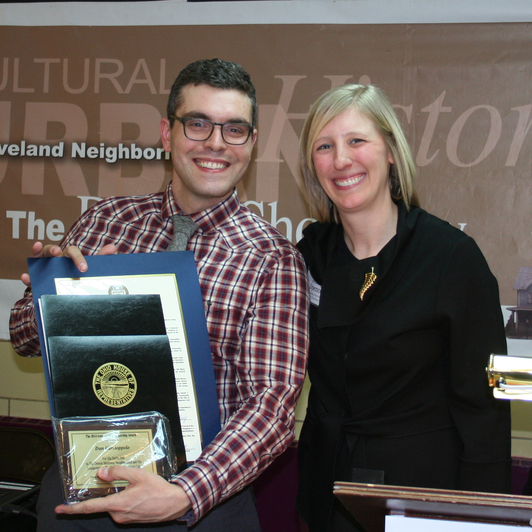 Detroit Shoreway Community Development Organization Managing Director Jenny Spencer presented the Irene Catlin Award to Dan Carcioppolo for his commitment to improving quality of life in the Detroit Shoreway neighborhood. Carcioppolo is co-chair of the Edgewater Hill Block Club as well as a member of a number of committees of the Detroit Shoreway Community Development Organization.