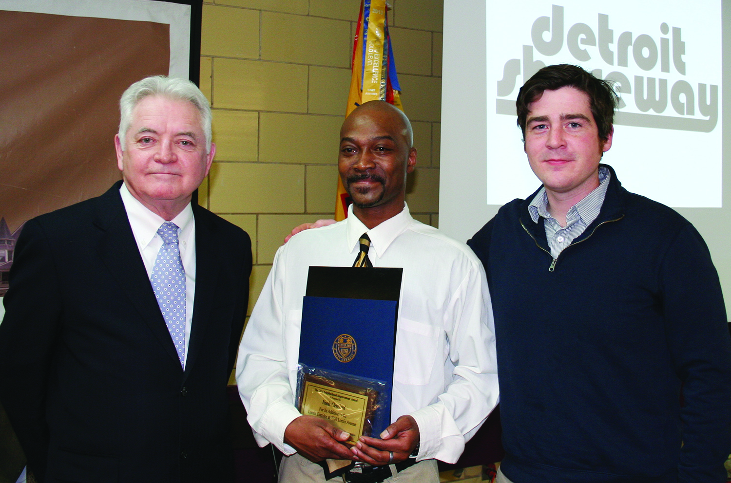 Thursday, February 26, 2015; Detroit Shoreway Community Development Organization (DSCDO) 41st Annual Meeting, Our Lady of Mt. Carmel Church Pope John Hall: (L-R) Dan Carcioppolo receives the Irene Catlin Award from DSCDO Managing Director Jenny Spencer. Carcioppolo received the award for his commitment to improving the quality of life for residents of the neighborhood as well as for his role as a neighborhood leader involved in the Edgewater Hill Block Club as well as a number of committees of the DSCDO.
