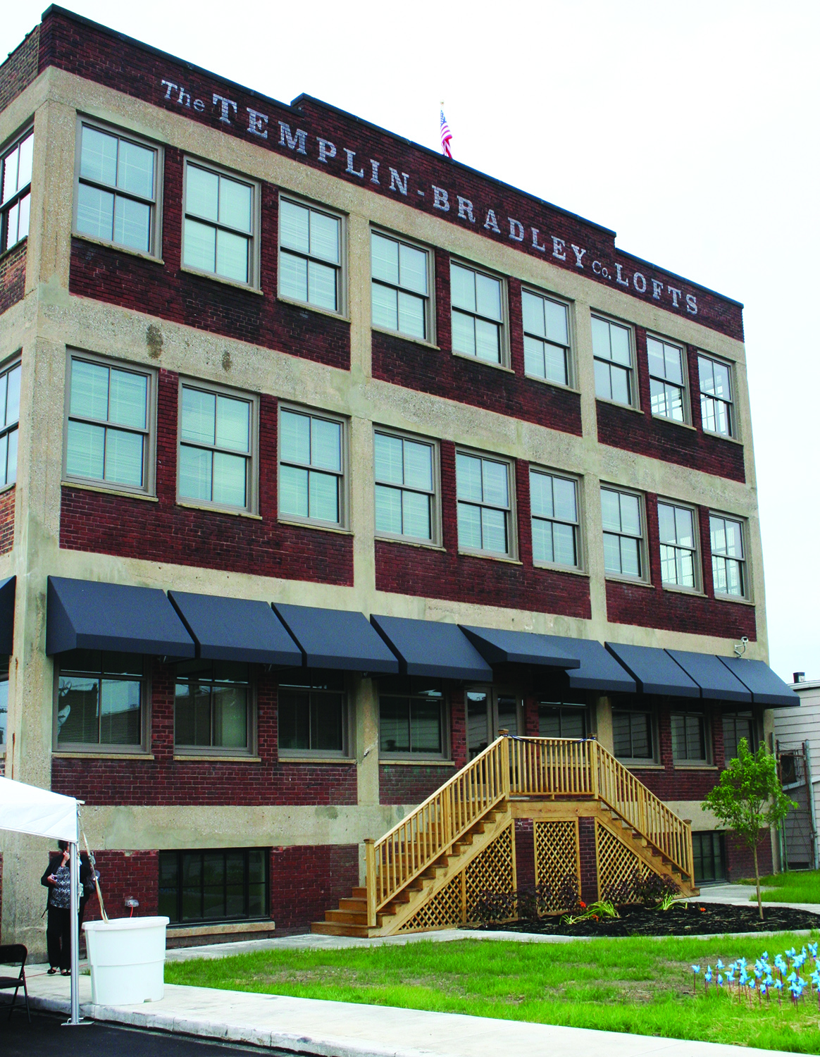 In addition to the ribbon cutting for the Templin-Bradley Co. Lofts building, the event included the unveiling of a historic marker and dedicated a public art project installed on the front lawn of the building.