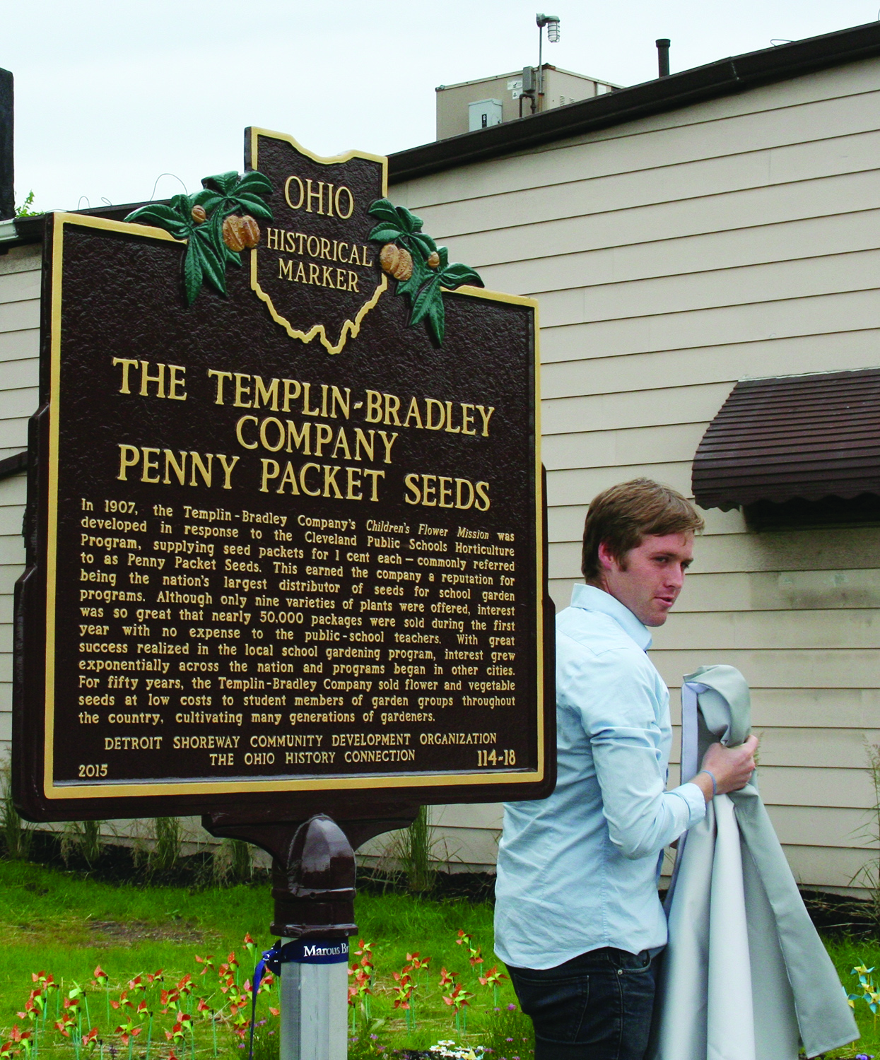 Austin Poyer of the Ohio History Connection unveiled the historic marker which notes the involvement of the Templin-Bradley Company in working with the Cleveland Public School’s horticultural program to provide the program with seeds, and how the Penny Seed Packets it developed with the Cleveland Public Schools were used to help develop student gardening groups throughout the nation.
