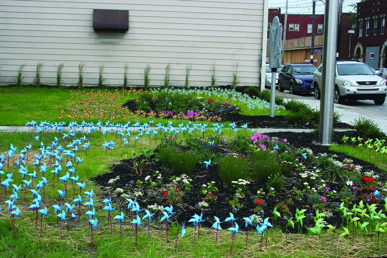 Sarah Siebert, Project Manager of LAND Studio, described the community involvement in selecting Steve O’Hearn’s Garden Mirrors as the public art piece for the site. The piece, which includes a garden surrounded by tiny plastic windmills and a large reflecting pole topped with a kinetic whirlgig, honors the test garden that the Templin-Bradley Company once displayed in its front lawn to the delight of many visitors.