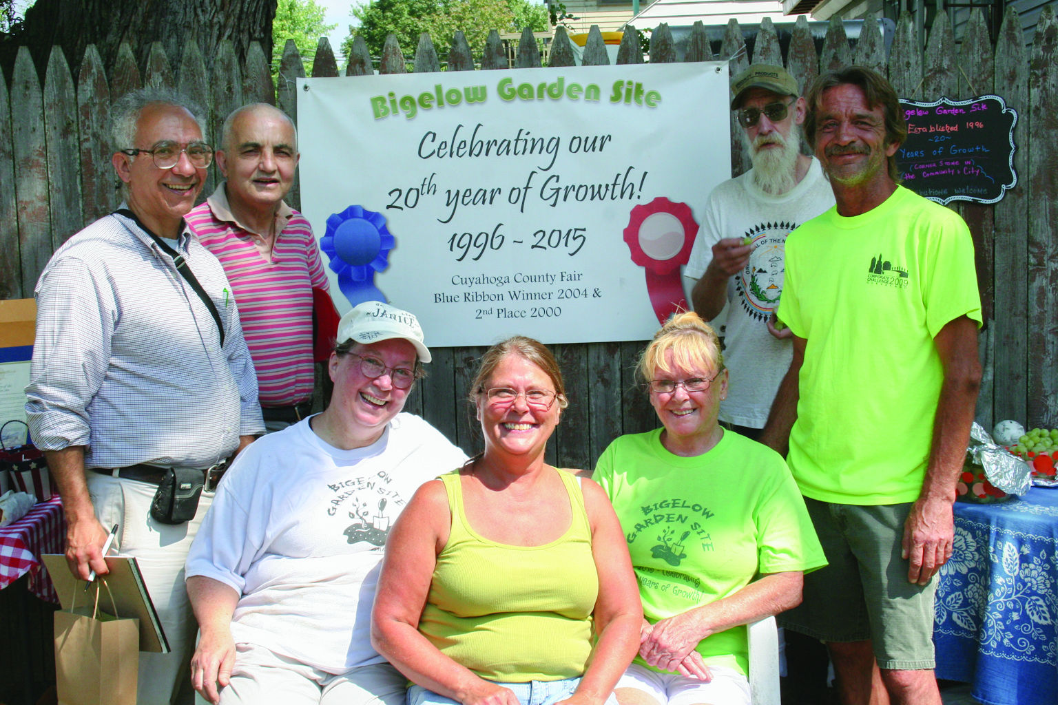 Saturday, August 8, 2015; 20th Anniversary Celebration, Bigelow Garden Site, 3164 W. 82nd Street: Bigelow gardeners: (L-R) Front Row: Garden Leader Jan Lascko, Linda Gilbert, and Patti Vandepol. (L-R) Back Row: Chuck Hoven, Ahmed Morad, Tom Mullen, and Brian Gilbert. (Not shown: Doug Hoven)