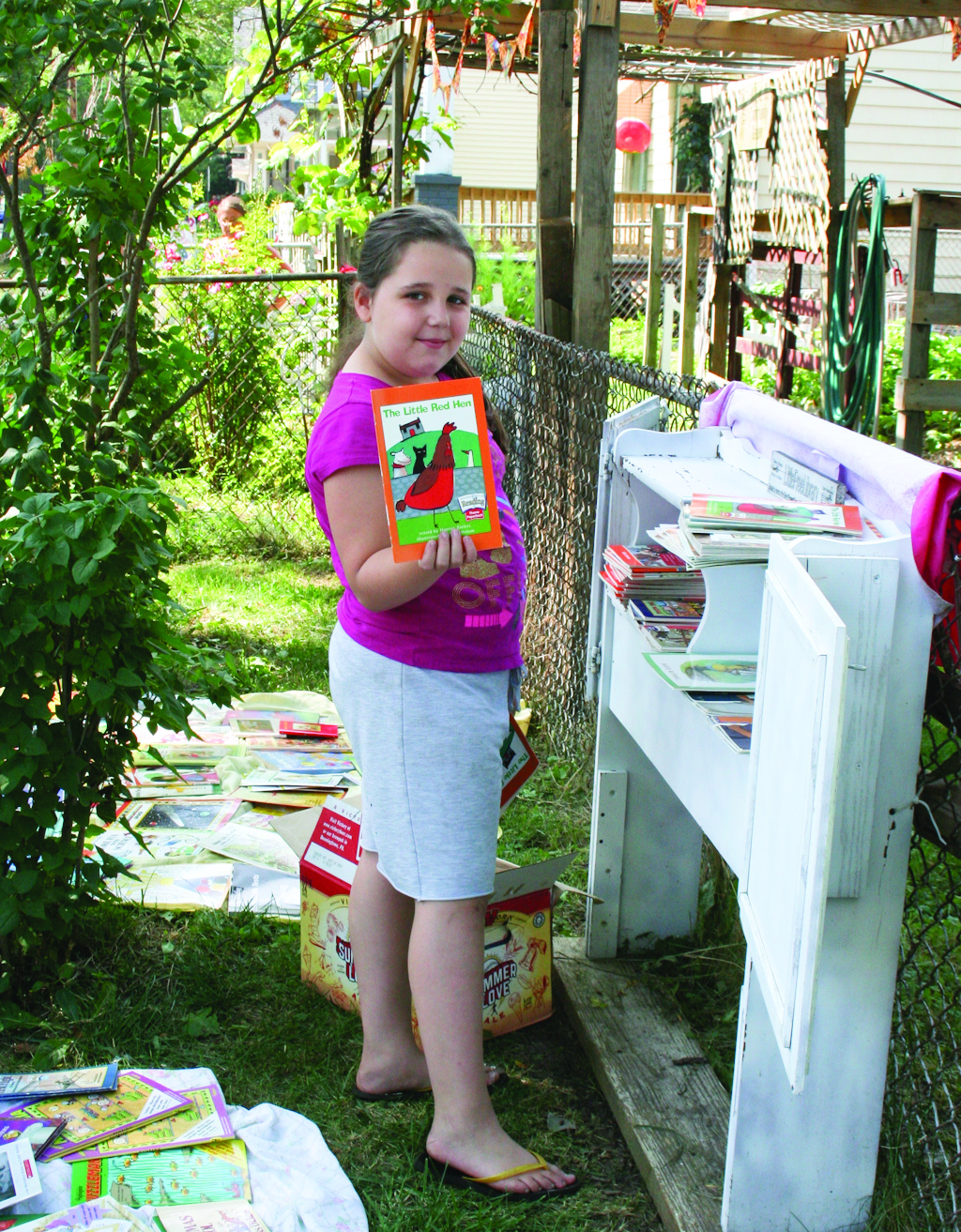 Saturday, August 8, 2015; 20th Anniversary Celebration, Bigelow Garden Site, 3164 W. 82nd Street: Mariah Myers, age 8, stocks the garden’s Little Free Library with donated books