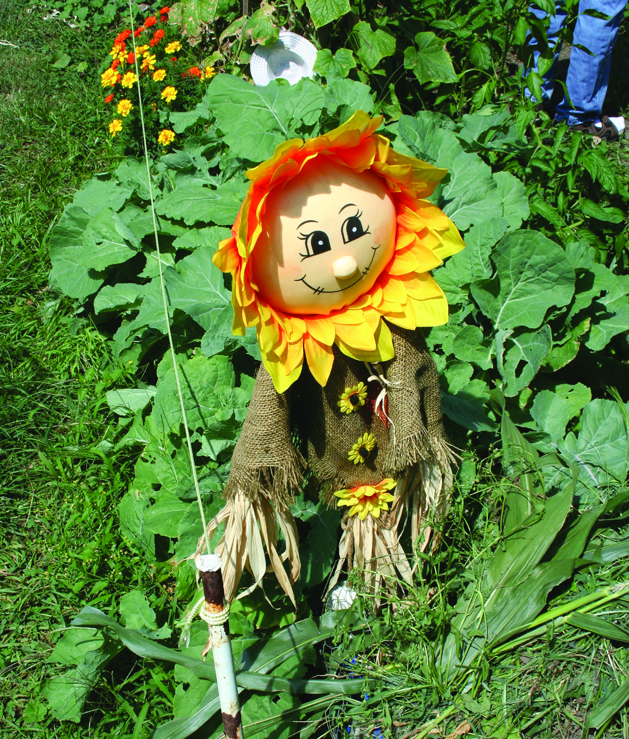 Saturday, August 8, 2015; 20th Anniversary Celebration, Bigelow Garden Site, 3164 W. 82nd Street: A sunflower scarecrow brightens Jan Lascko’s garden.