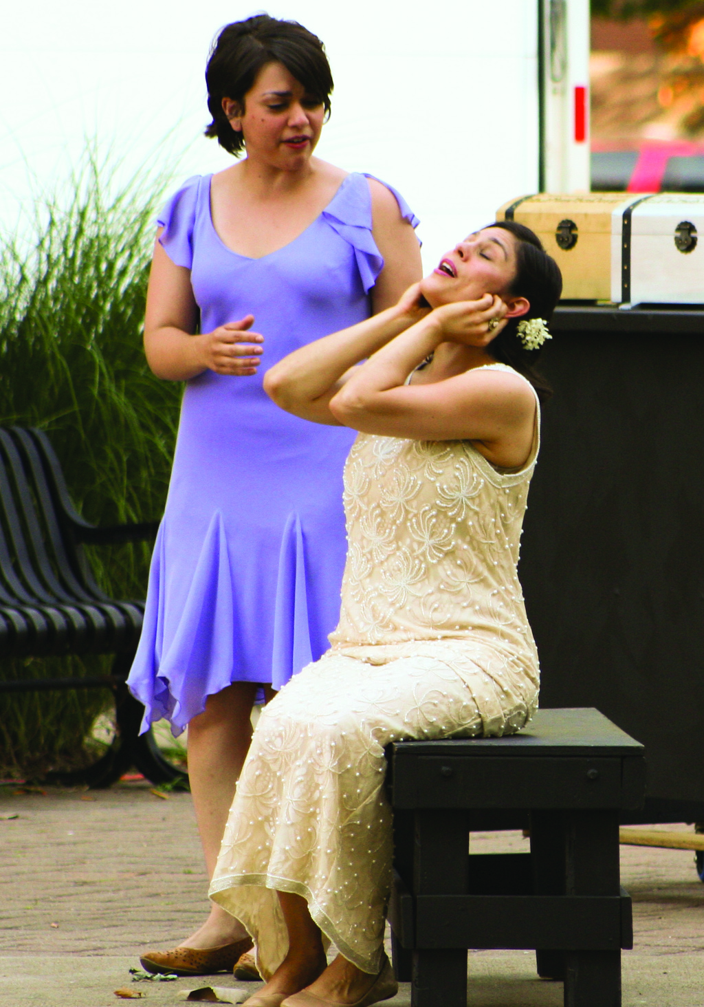 Sunday, August 2, 2015; Cleveland Shakespeare Festival performance of The Merchant of Venice, Arts in August, free art programming in Tremont’s Lincoln Park: Portia (portrayed by Faith Whitacre) shares her hopes with her maid in waiting, Nerissa (portrayed by Hillary Wheelock) that her favorite suitor, Bassanio, will pass the test designed by her father for those seeking her hand in marriage