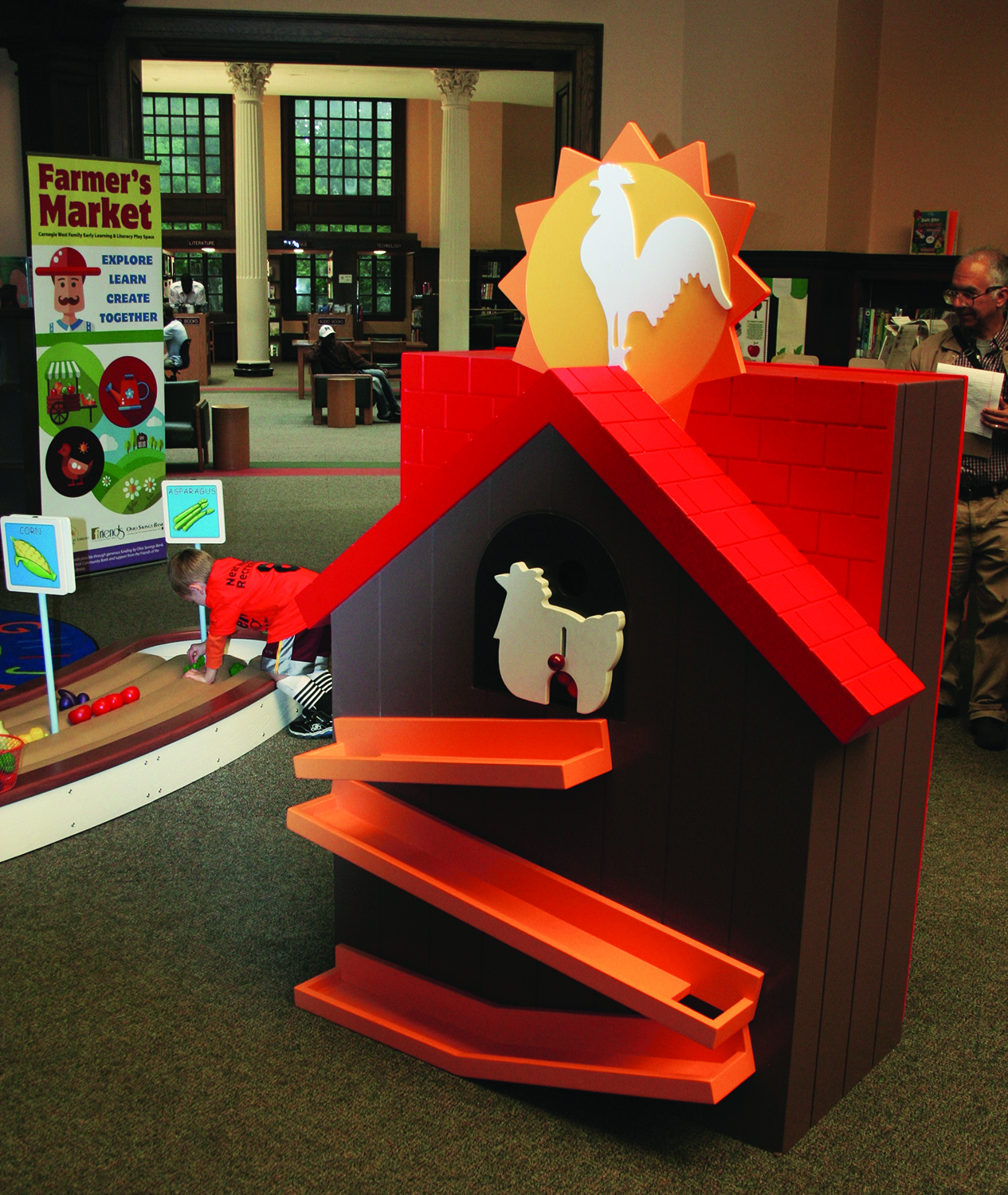 Saturday, September 12, 2015; Carnegie West Library’s Family Learning & Literacy Play Space, 1900 Fulton Road: The chicken coop is one of the farm stations where children can gather eggs and take them to the farmers market.