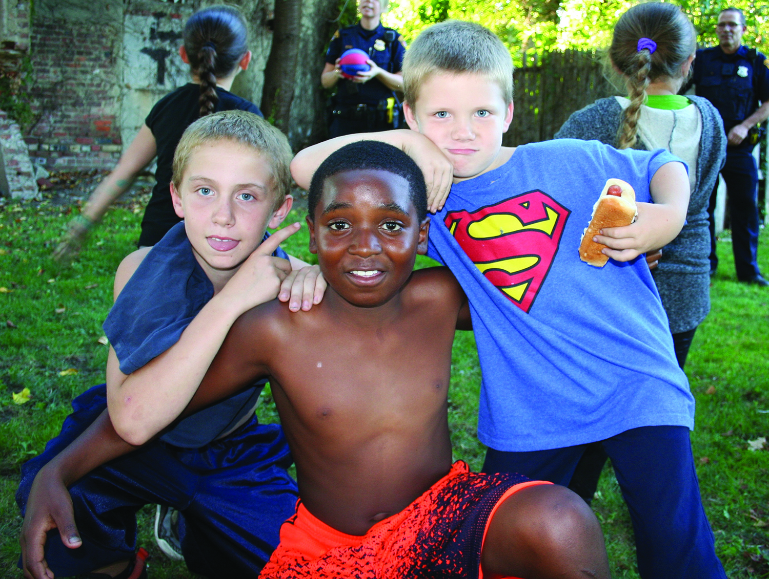 Thursday, September 24, 2015; Stockyard Clark Fulton Brooklyn Centre Safety Committee and International Village Neighborhood Cookout with the Cops: Zachary Fiocco, age 11; Amon Tucker, age 11; and Bobby Roark, age 7; take a break from a touch football game with Second District Police Officer Hubert Kidd.