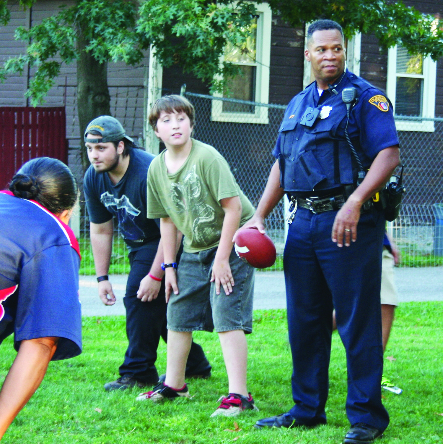 Thursday, September 24, 2015; International Village Neighborhood’s Cookout with the Cops: Second District Police Officer Hubert Kidd plays quarterback, joining neighborhood residents in a game of touch football.