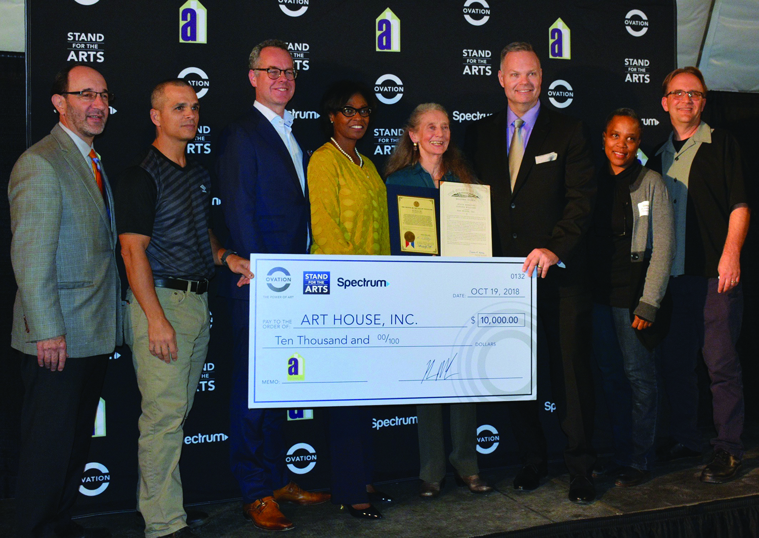 October 19, 2018; Stand for the Arts Award Ceremony honoring Art House, 3119 Denison Avenue: Art House receives a $10,000 check from Spectrum and Ovation TV during a Stand for the Arts Award Ceremony. (L-R): Ward 12 Councilman Anthony Brancatelli, Artist Augusto Bordelois, Charter Communications’ (Spectrum) Regional Vice President of Government Affairs Gary Underwood, District 21 State Senator Sandra Williams, Art House Executive Director Laila Voss, Ovation TV’s Vice President for Content Distribution and Marketing Sol Doten, Artist Gina Washington, Art Teacher Christian Osterland.