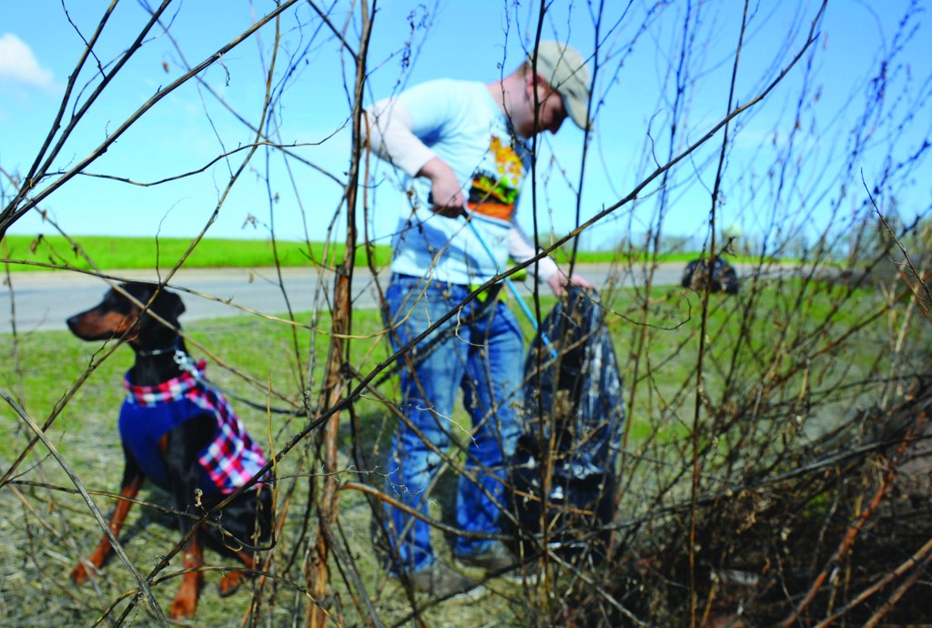 Saturday, May 11, 2019; RiverSweep, W. 7thStreet hill, Tremont neighborhood: Victor Kitsis, accompanied by his dog Bella, joins with other Tremont residents to pick up debris in the neighborhood. Tremont West Development Corporation Community Involvement Manager Scott Rosenstein estimated that about 100 Tremont residents volunteered for the Ohio & Erie Canalway Partners’ RiverSweep clean-up day.