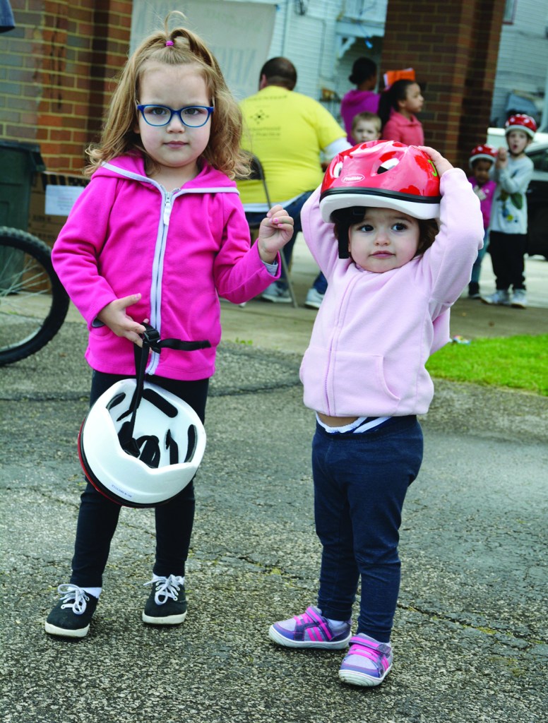 Saturday, May 18, 2019; Stockyard Bike-A-Thon, Clark School, 5550 Clark Avenue: Jailene Leon, age 3, and Jadah Leon, age 22 months, are ready for a ride with their new bicycle helmets.