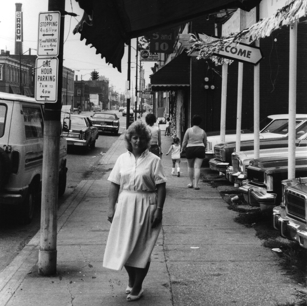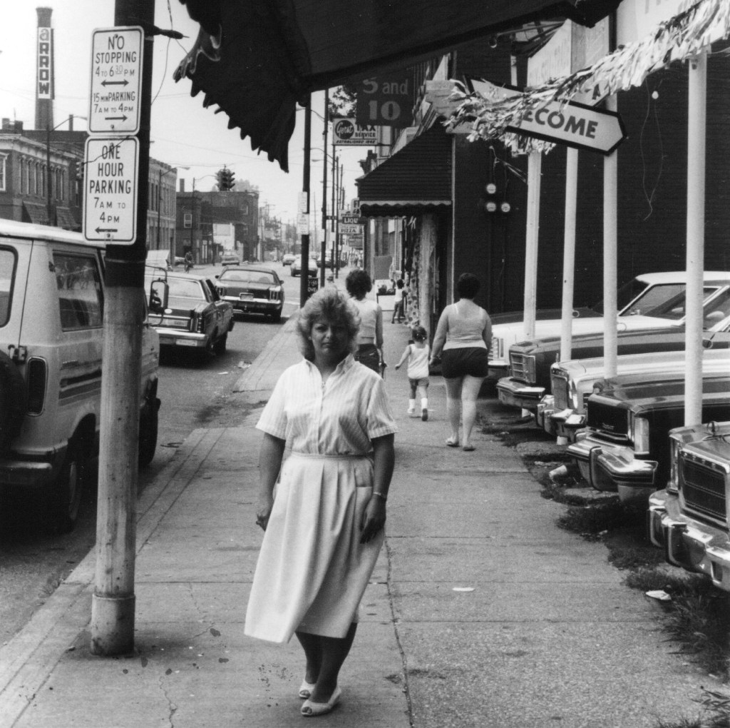 July 1985; Lorain Avenue: Tina Gayer, co-chair of the Lorain Avenue Business Association, sees crime prevention as the highest priority. In this photo from the Plain Pressarchives, Gayer is standing in front of a car lot on W 47thand Lorain Avenue. In the background behind her you can see a sign for a 5 & 10 store and Gerst Tax Services on the north side of Lorain Avenue, and Arrow International’s sign, a company that made bingo and charity supplies, appearing on the south side.