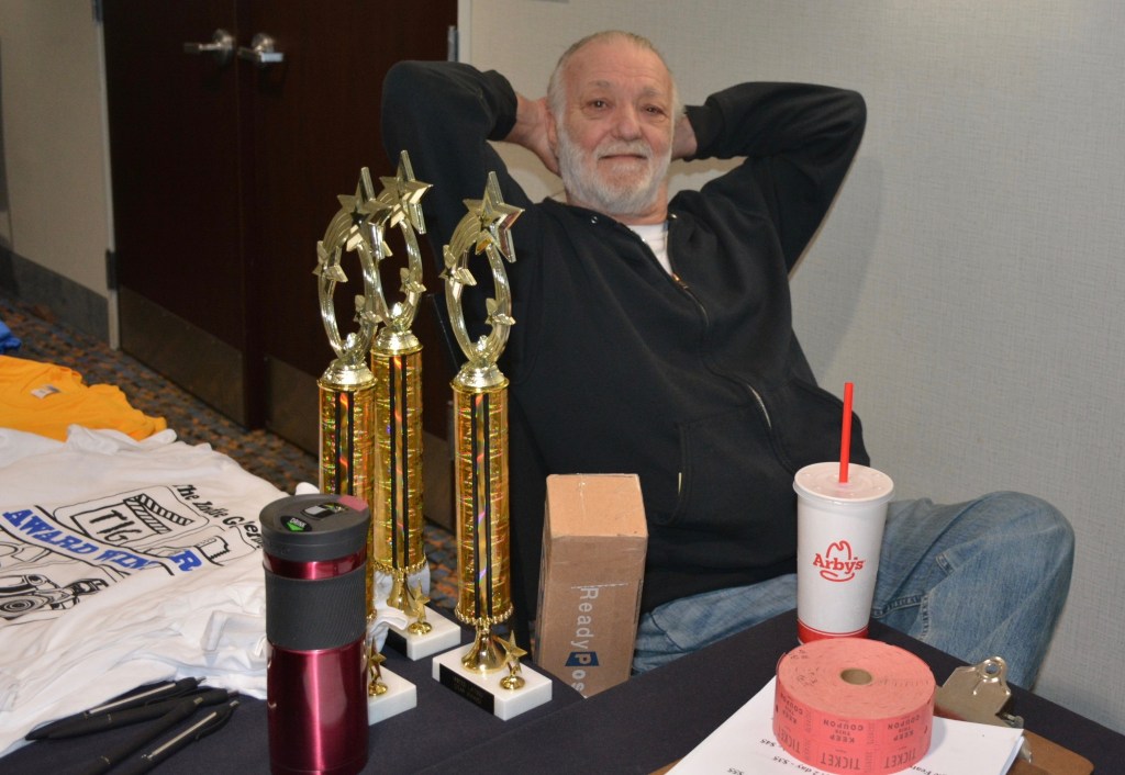 Friday, August 9, 2019; United Latino Film Festival, Holiday Inn, Mentor, Ohio: Ray Szuch, founder and promoter of the United Latino Film Festival, greets guests at the festival while sitting behind a display of the trophies for the award-winning films. In addition to running the film festival, Szuch is involved film production, and hosts and teaches acting and karate at his storefront on Storer Avenue.