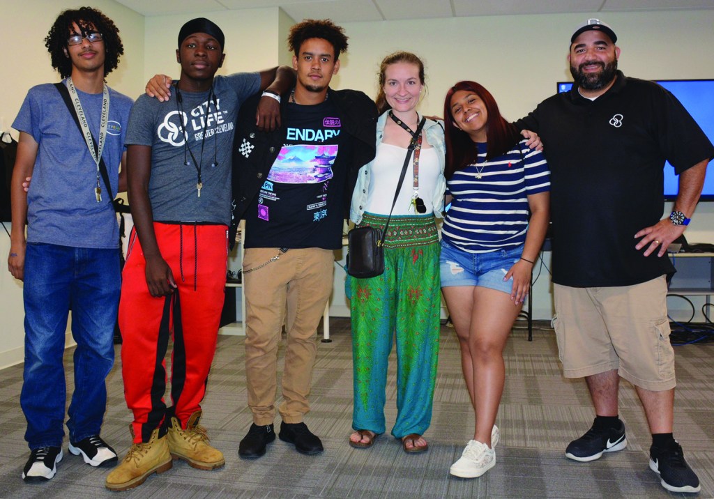 Thursday, August 15, 2019; Open House, MetroHealth Medical Center, 2500 MetroHealth Drive: A group of high school students and City Life Staff members involved in planning for future youth programs in the neighborhood, visited the MetroHealth Open House. The group especially enjoyed putting on goggles to participate in a virtual reality tour of the future hospital building. (L-R) Felix Latimer, Javon Wellson, J-Sun Martinez, Jamie Kinnett (City Life Center staff member), Joana Mendez, and Jonny Fine (City Life Center Director).