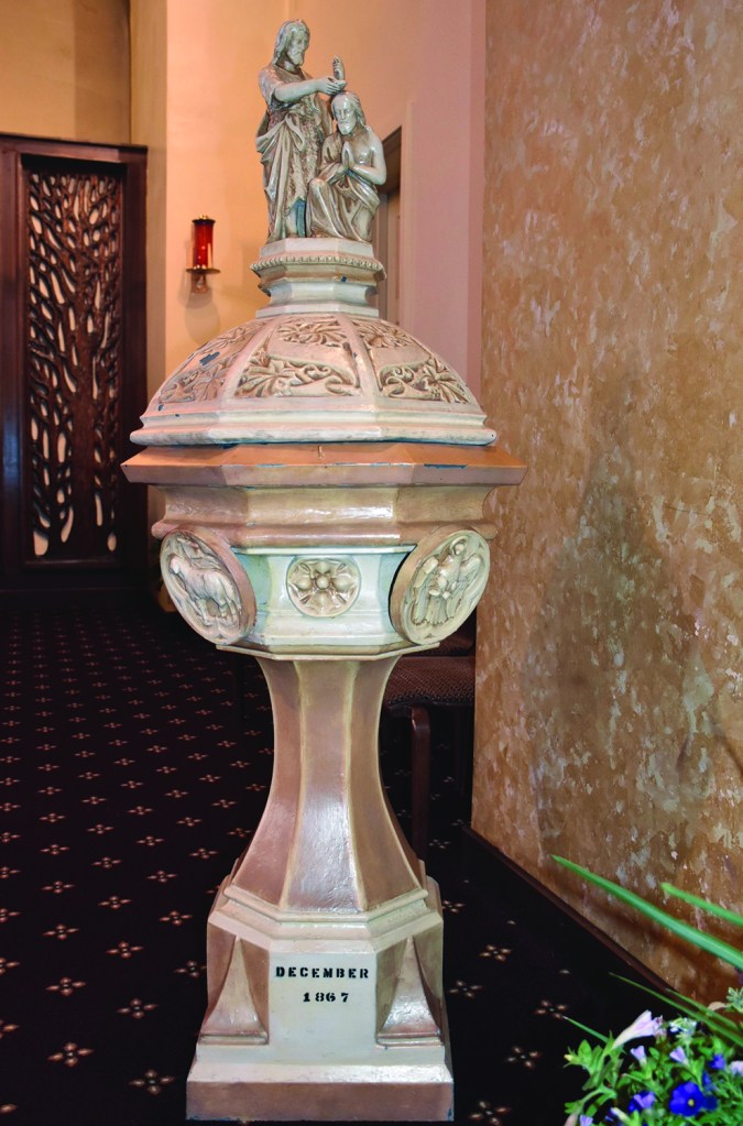 Friday, September 20, 2019; St. Malachi Church, 2459 Washington Avenue: The baptismal font is the same font used in the original church. It was saved from the December 23, 1943 fire.