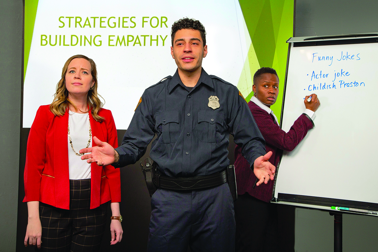 Cleveland Public Theatre presents the world premiere of the production Breakout Session (or Frogorse) by Nikkole Salter, directed by Beth Wood. The play, inspired by Cleveland’s Consent Decree with the U.S. Department of Justice will run through March 14th. Pictured (from left): Jess Moore, Enrique Miguel, Nicole Sumlin*. *Actor appears courtesy of Actors’ Equity Association, the Union of Professional Actors and Stage Managers in the United States.