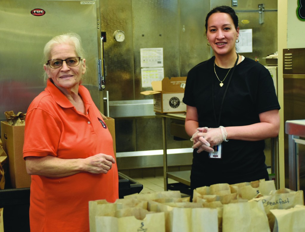 Wednesday, March 18, 2020, Buhrer Dual Language School, 1600 Buhrer Avenue: Buhrer School staff members Sherry Rowland and Lissette Cuevas prepared bags with breakfasts and lunches and they are ready for children to come and pick them up.