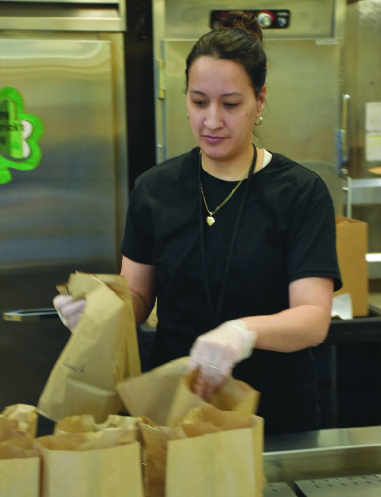 Wednesday, March 18, 2020, 5550 Clark Avenue: Clark School Cafeteria Worker Melissa Ansel passes out packaged breakfasts and lunches to neighborhood children from the back of Clark School.
