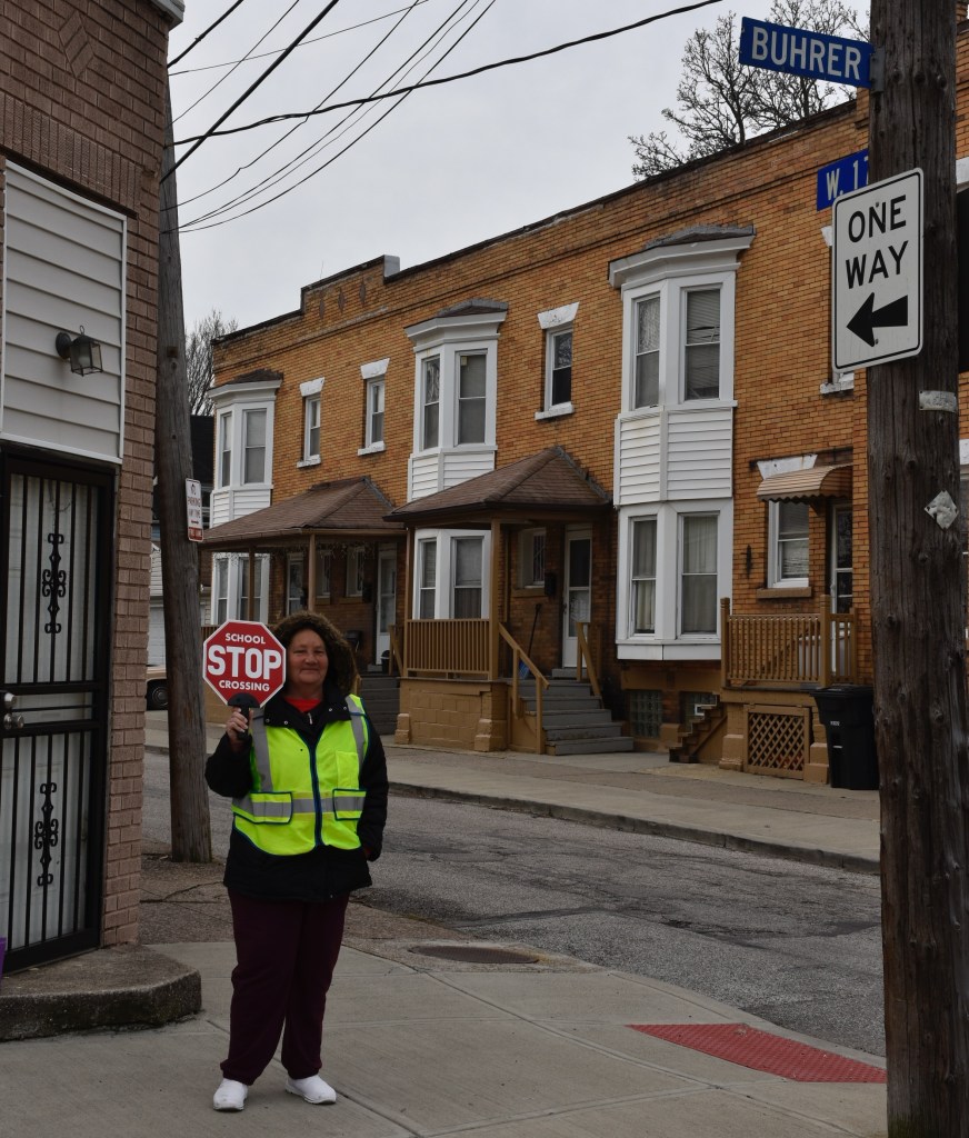 Wednesday, March 18, 2020, Buhrer Dual Language School, Corner of W. 17th and Buhrer: School Crossing Guard Judy Feliciano is ready to help children cross the street on their way to pick up bagged carry out breakfasts and lunches.