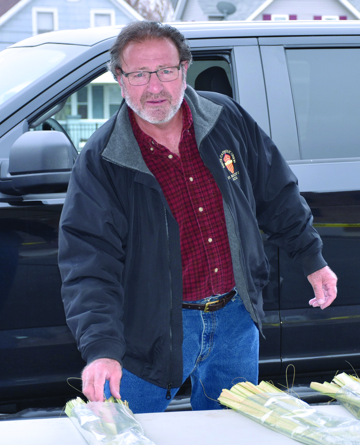 Palm Sunday, April 5, 2020; St. Rocco Church, 3205 Fulton Road: Matt Milia, a longtime St. Rocco parishioner, picks up some blessed palms.
