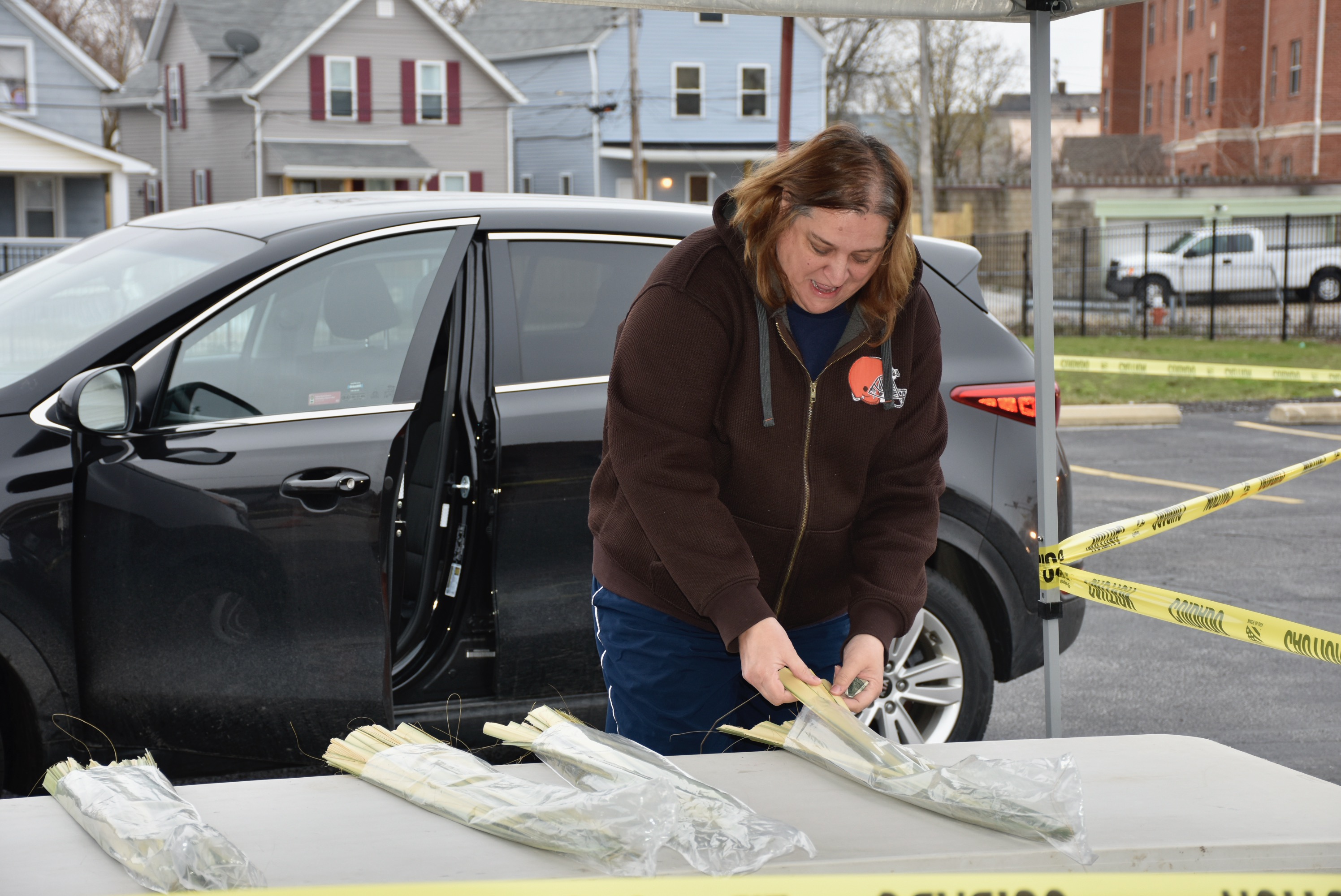 Palm Sunday, April 5, 2020; St. Rocco Church, 3205 Fulton Road: Jeanne Wright picks up palms to deliver to multiple families.