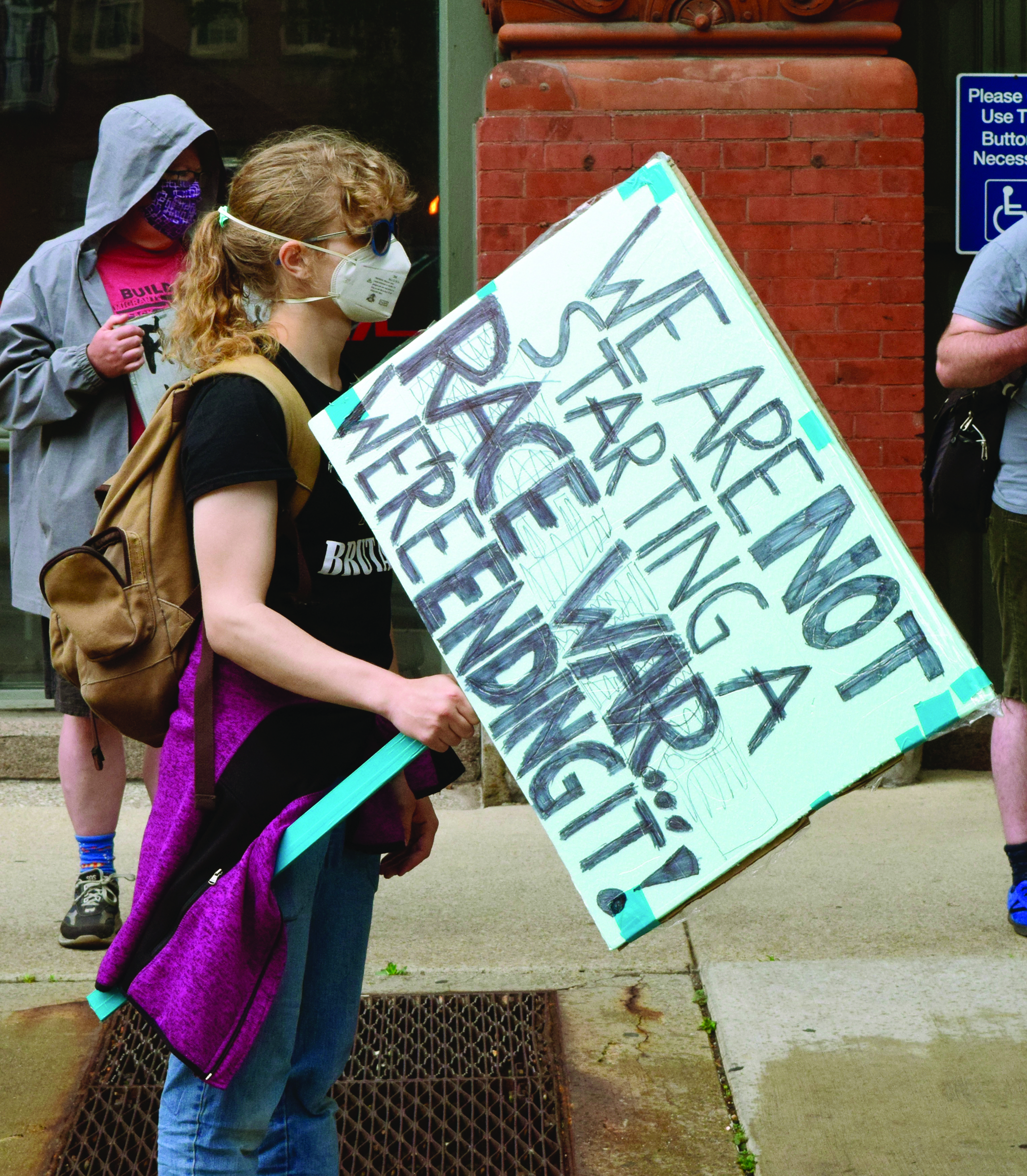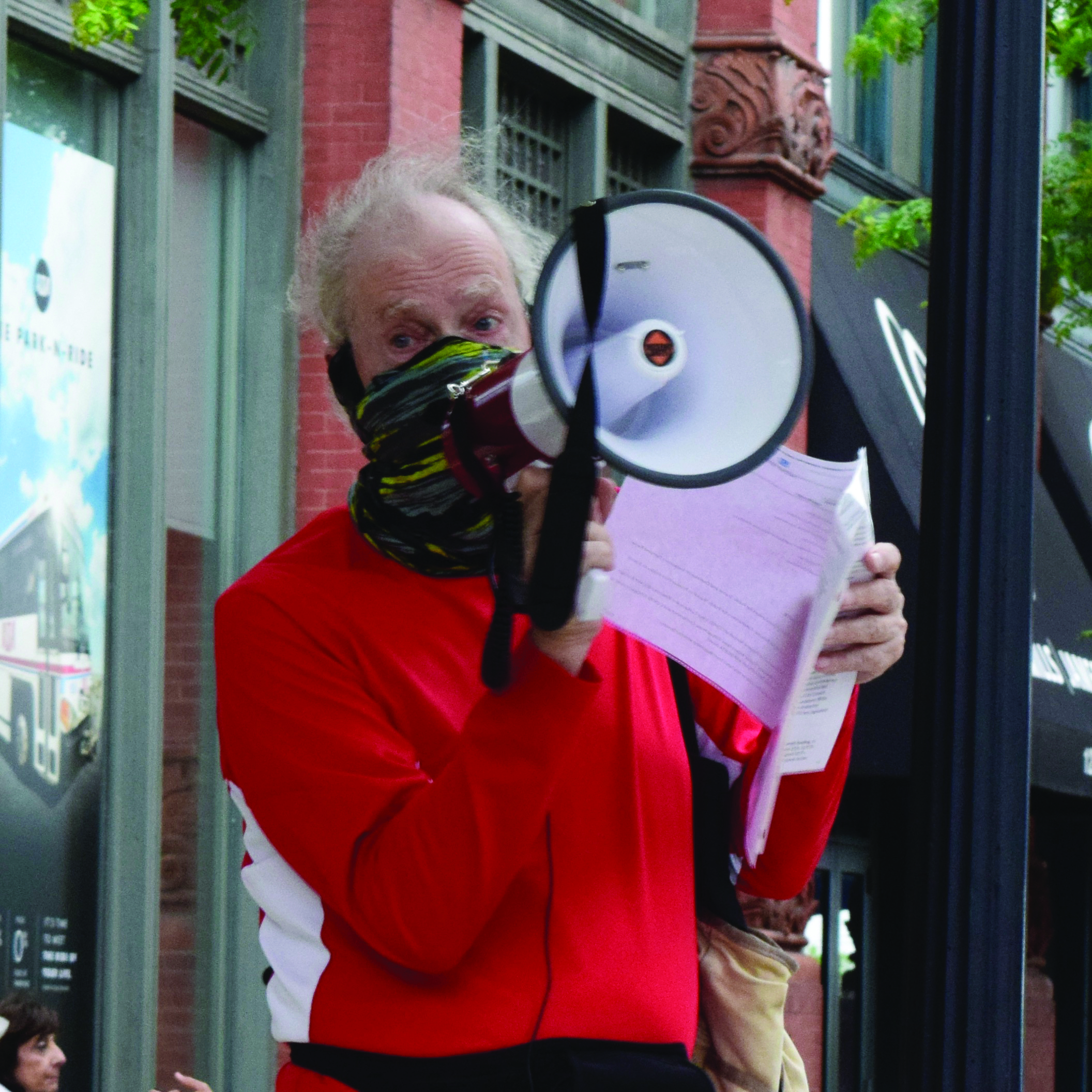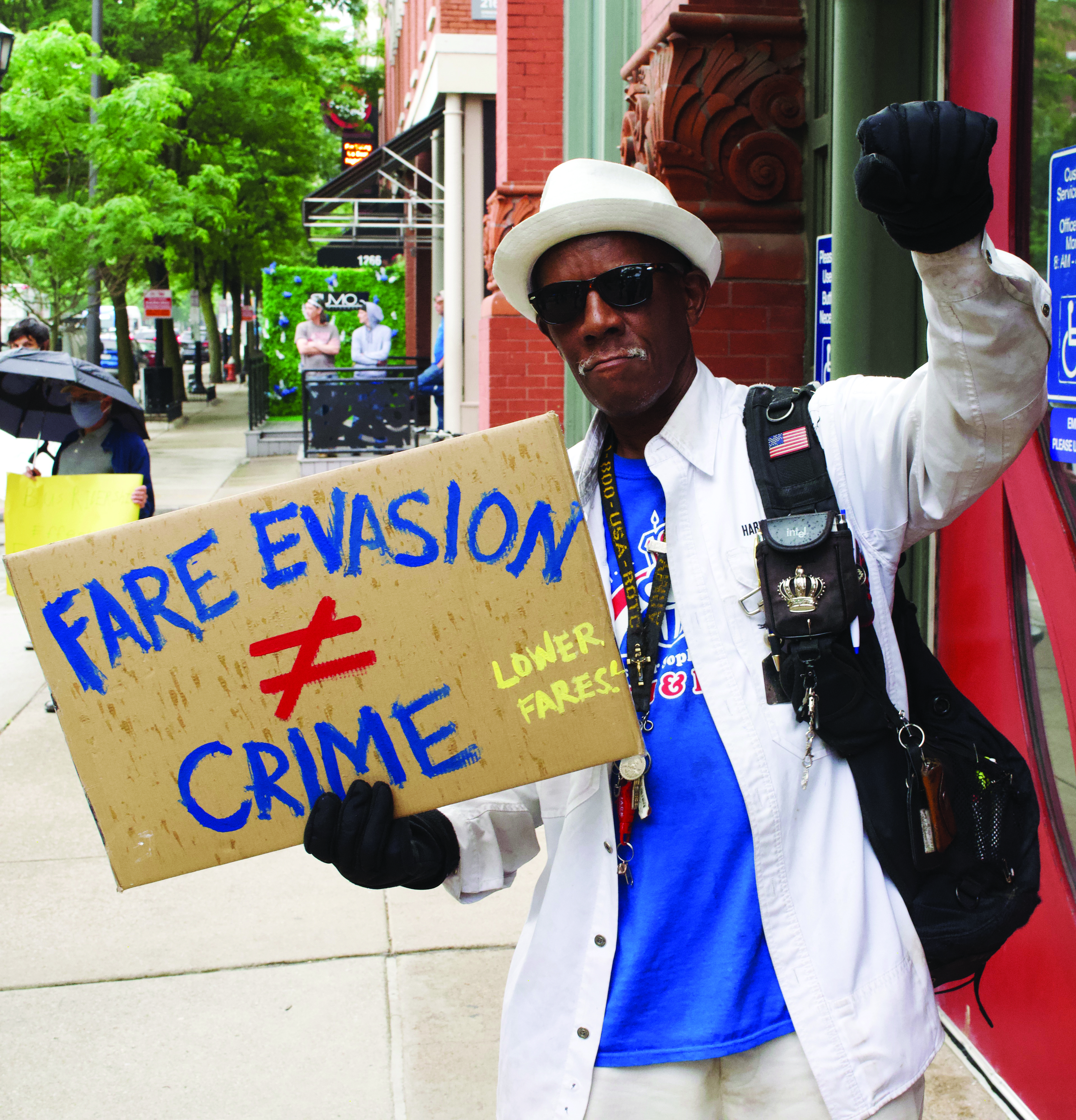 Tuesday, June 23, 2020; Clevelanders for Public Transit Rally, Greater Cleveland Regional Transit Authority Headquarters, W. 6th Street: A member of Clevelanders for Public Transit rallies for fare reductions and against the criminalization of fare evasion.