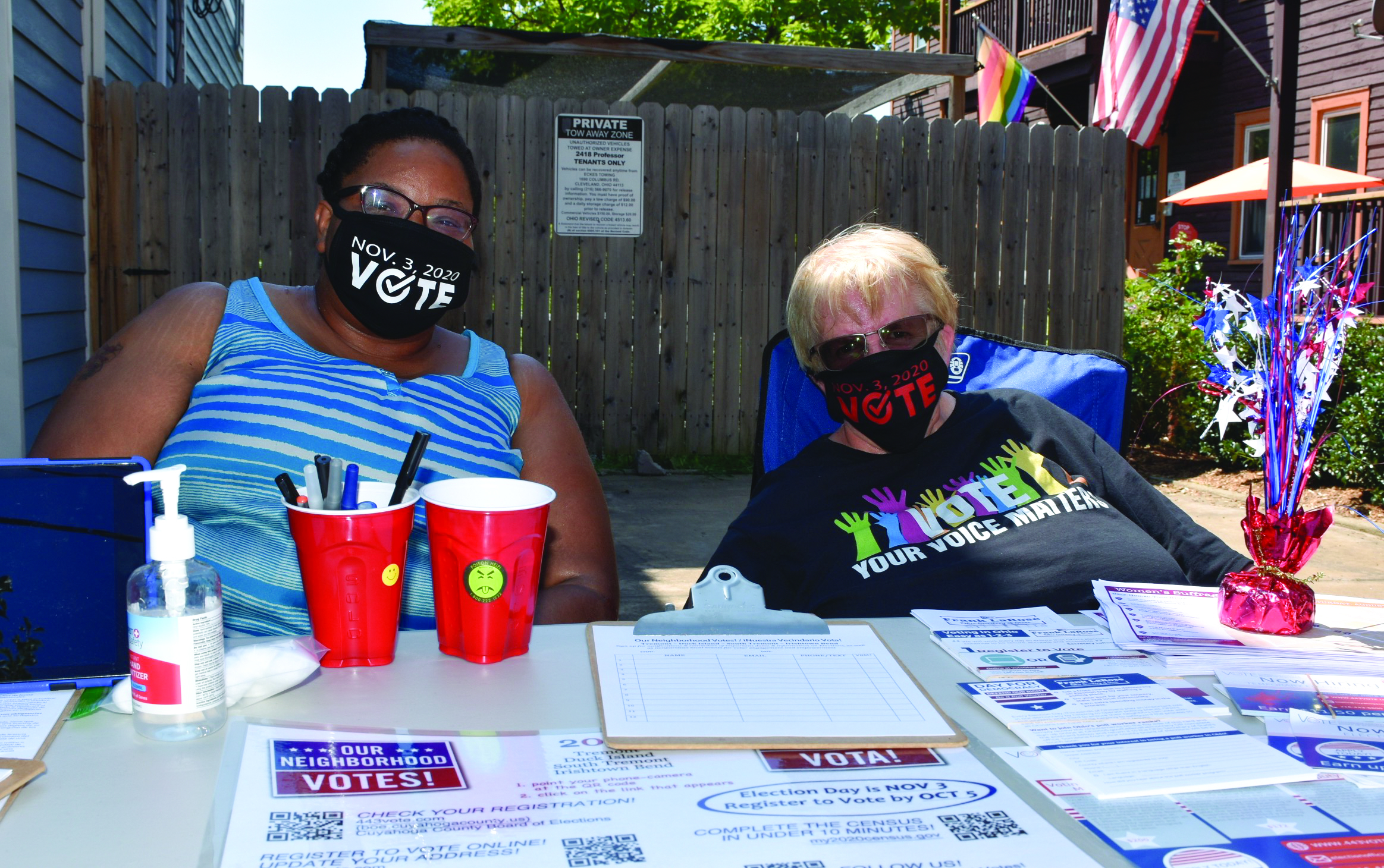 Saturday, August 22, 2020; Our Neighborhood Votes Celebration of the 100th Anniversary of the Passage of the 19th Amendment enshrining the right of women to vote, Professor Avenue, Tremont neighborhood: (L-R) Seronica Powell and Marian Heffernan work to register new voters and pass out vote by mail applications.