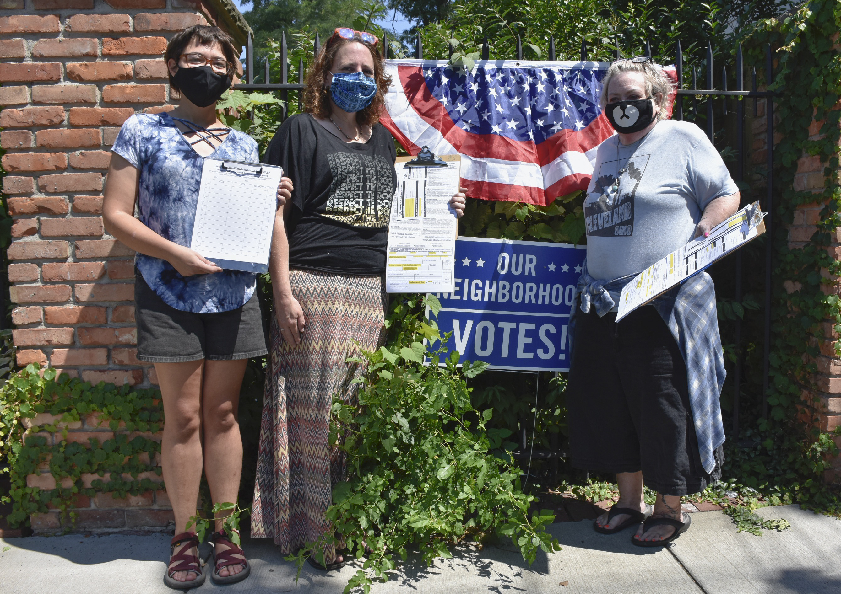 Saturday, August 22, 2020; Our Neighborhood Votes Celebration of the 100th Anniversary of the Passage of the 19th Amendment enshrining the right of women to vote, Professor Avenue, Tremont neighborhood: (L-R) Shannon Adams, Becca Riker and Sandy Smith are ready to help register new voters. Sandy Smith urged voters to check and update, if necessary, their registration, or request an absentee ballot by visiting: 443vote.com.