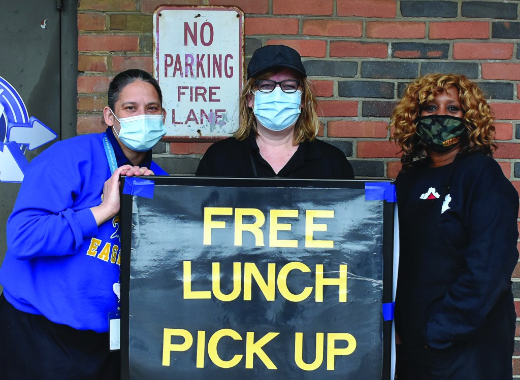 Friday, January 15, 2021; Grab and Go Meals, Scranton School, 1991 Barber Avenue: Scranton School staff members (L-R) Jessica Irizarry, Laurie McCulloch and Kenetta Crider pose with their sign. The sign at the rear of the building lets children, parents and guardians know where they can pick up lunches. Cleveland Metropolitan School District K-8 schools offer free lunches to all children ages 18 and under on Mondays, Tuesdays, Thursdays and Fridays from 10:30 a.m. – 2 p.m.