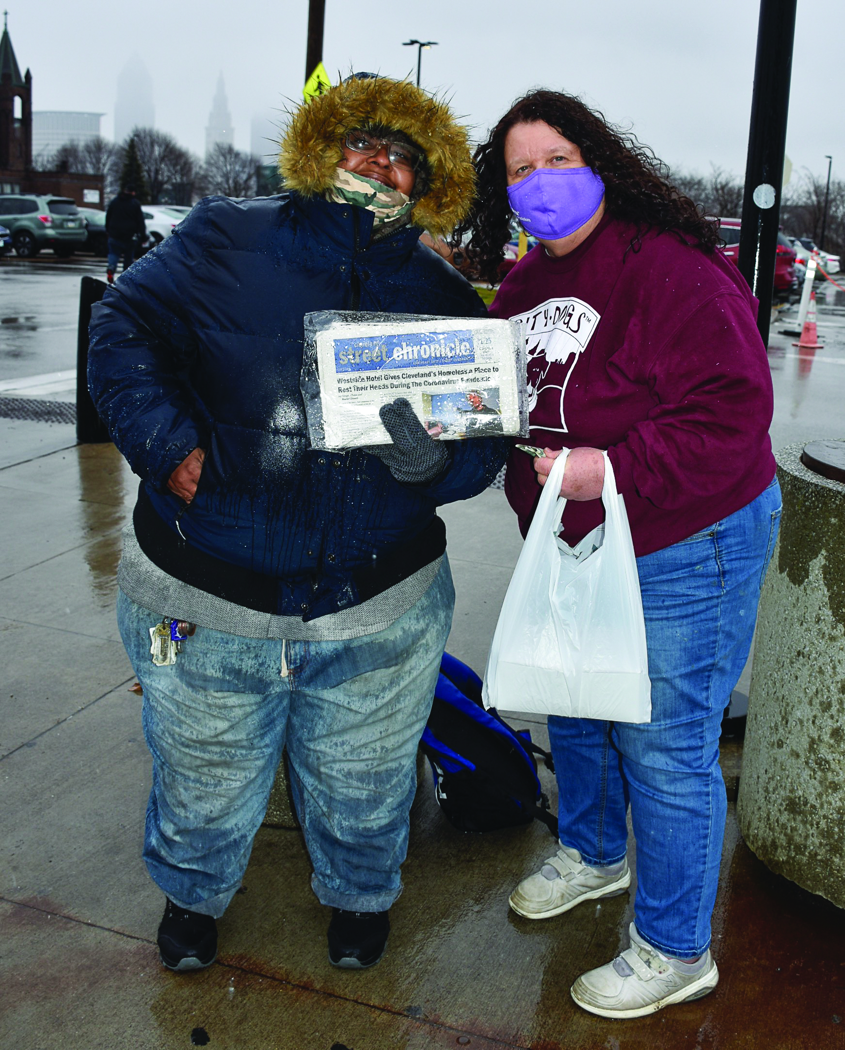 Friday, January 15, 2021; rear of West Side Market, 1979 W. 25th Street: Plain Press Editor Debbie Sadlon purchases a Cleveland Street Chronicle from Kim Goodman, aka Super Mutt. Goodman is both a writer and a salesperson for the Cleveland Street Chronicle, the newspaper published by the Northeast Ohio Coalition for the Homeless.