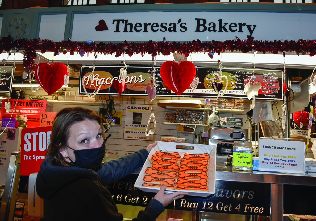 Friday, January 15, 2021; Theresa’s Bakery, Stand D-9, West Side Market, W. 25th and Lorain Avenue: Theresa’s Bakery Owner Sabrina Catlin holds up a tray of Dawg Pound Cookies made ready for the Cleveland’s Browns playoff game against the Kansas City Chiefs.