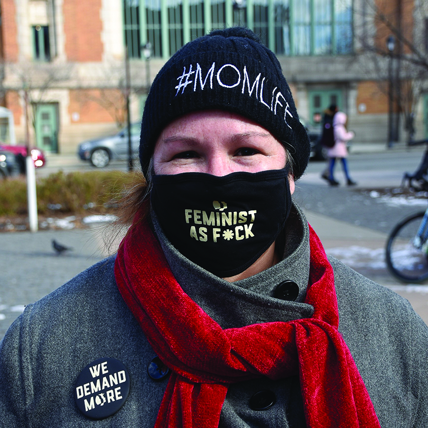 Saturday, January 23, 2021; Cleveland Women’s March Rally, Market Square Park, W. 25th and Lorain Avenue: Brandie Wagner, a feminist mom from Courtland, Ohio, brought a sign that says: “We are only going to get browner & queerer & louder & stronger & prouder & we are going to watch the dinosaurs die out!!”