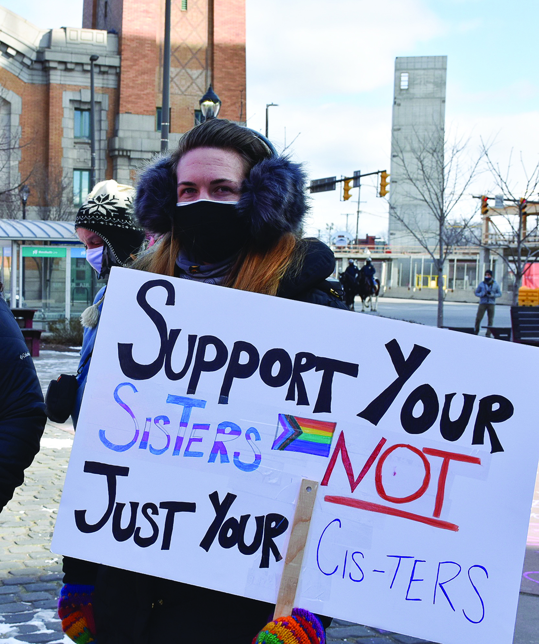 Saturday, January 23, 2021; Cleveland Women’s March Rally, Market Square Park, W. 25th and Lorain Avenue: The 2021 Cleveland Women’s March, organized by community activist Kathy Wray Coleman, began at Market Square Park with a rally. This protester sends a message “Support your Sisters, Not Just your Cis-ters.”
