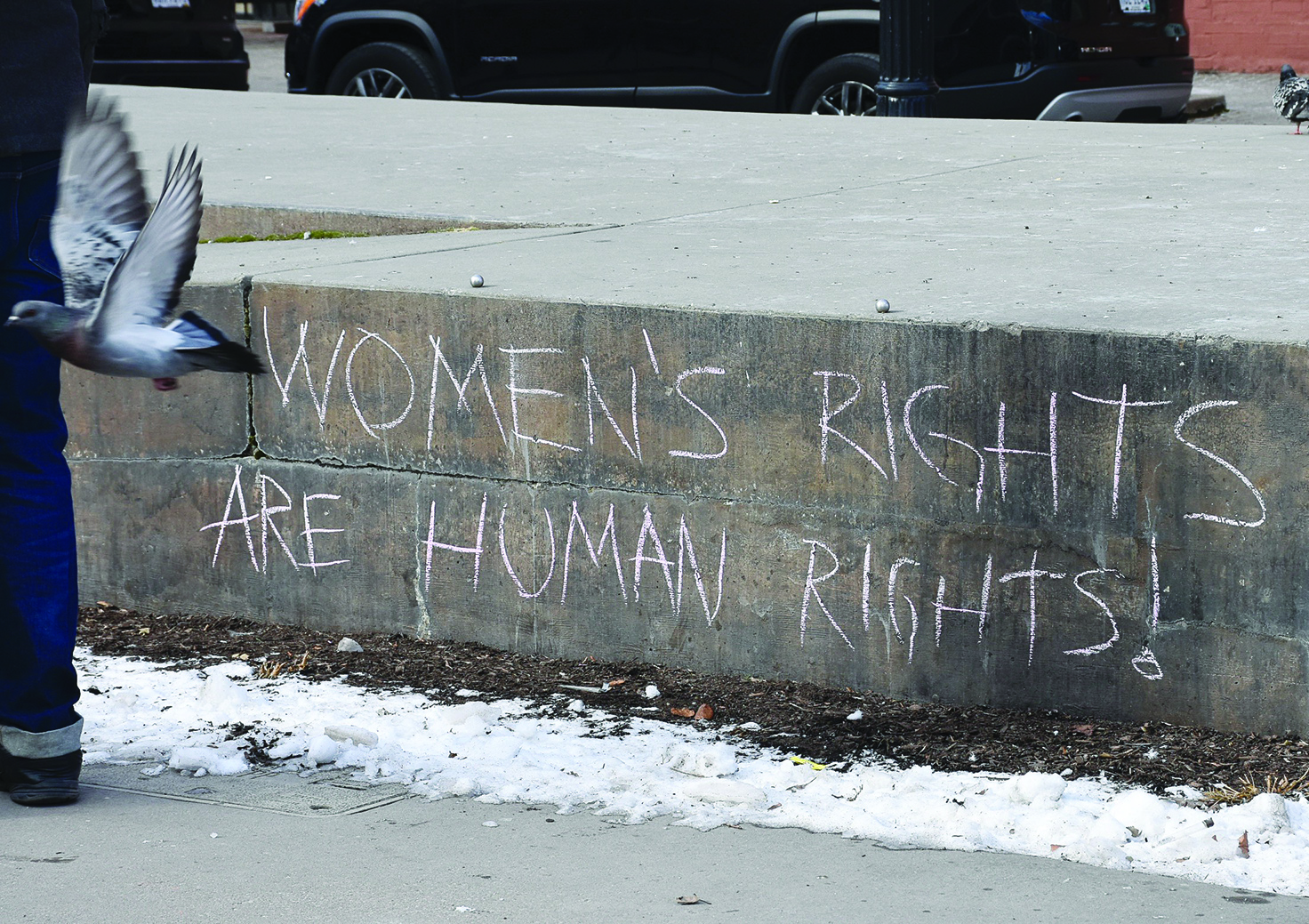 Saturday, January 23, 2021; Cleveland Women’s March Rally, Market Square Park, W. 25th and Lorain Avenue: A pigeon flies off of the bandstand at Market Square Park above a message scrawled in chalk “Women’s Rights are Human Rights.”