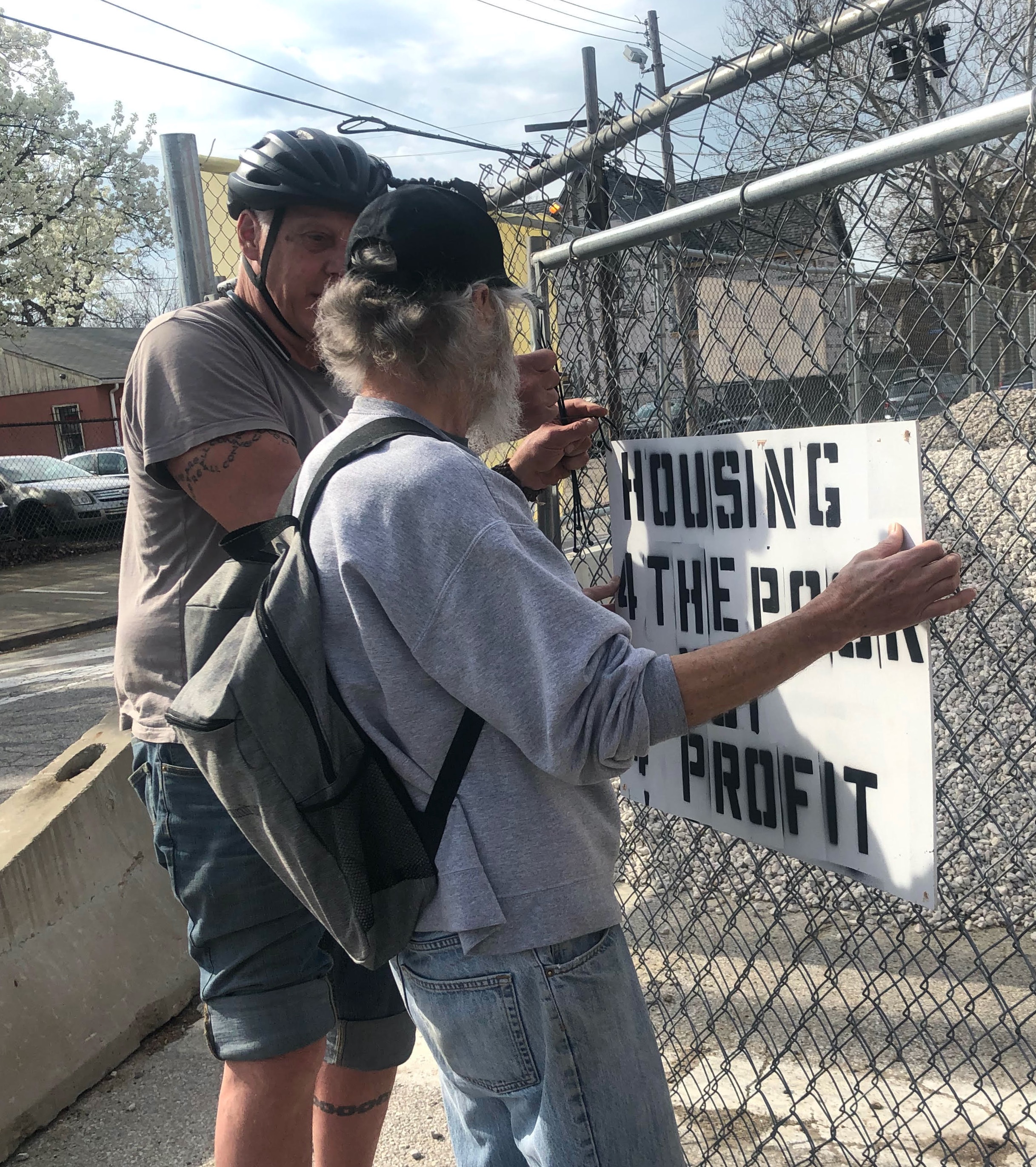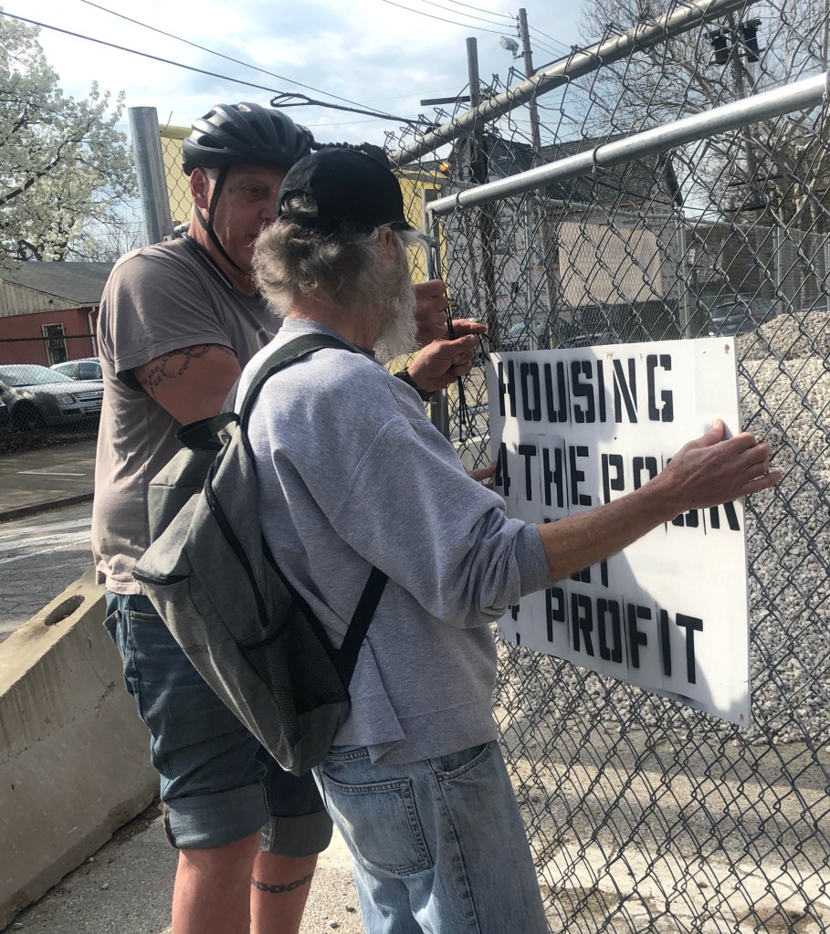 Friday April 9th, 2021; My Place Homes development on the northeast side of W. 41st and Lorain Avenue: Paul Sherlock and Jim Schlecht hang their protest sign that says: “Housing 4 the Poor, Not 4 Profit.”