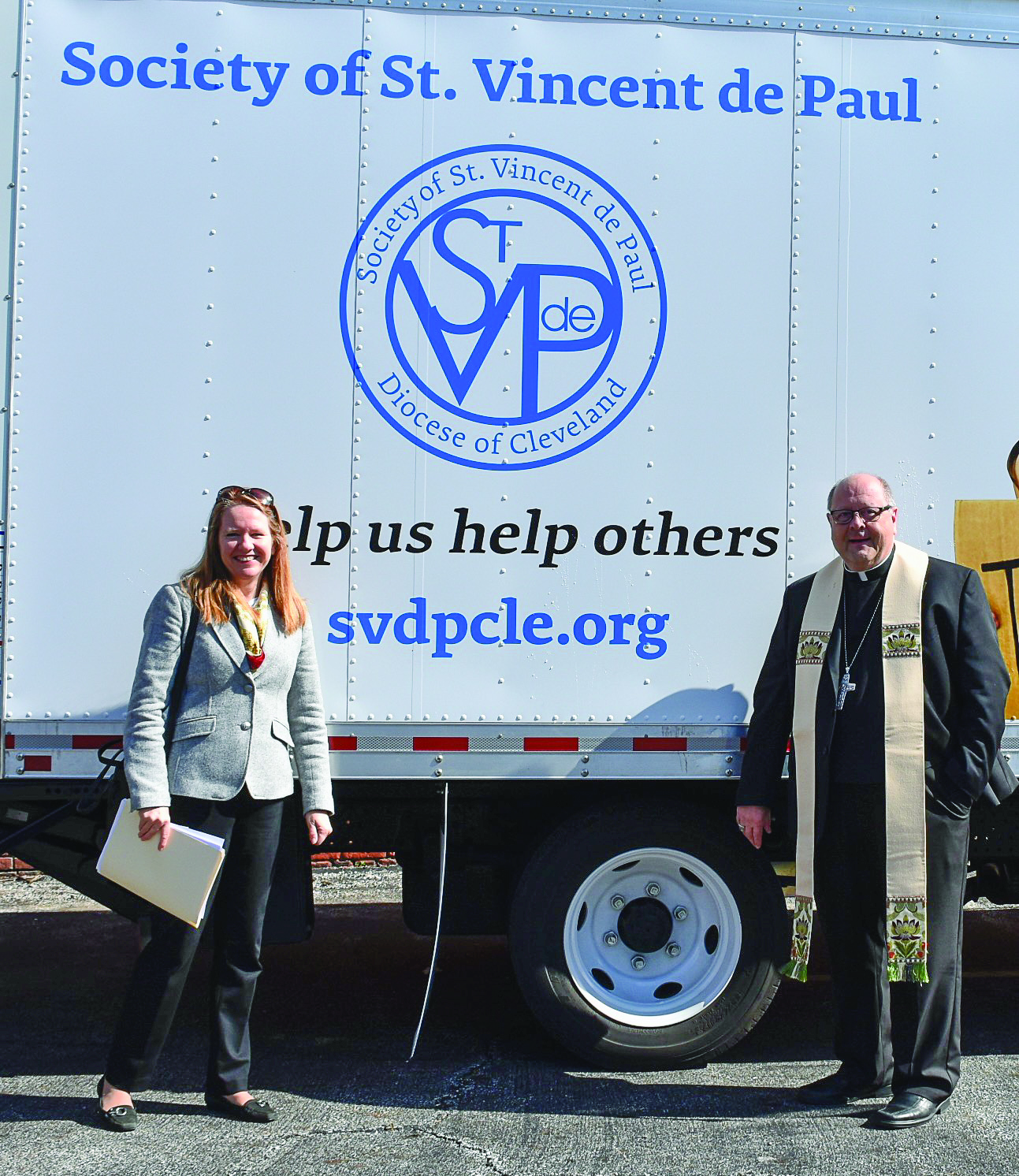 Monday, May 10, 2021; Blessing of new St. Vincent de Paul Society (SVDP) Box Truck, Brookside Hunger Center, Pearl & Archwood: St. Vincent de Paul Society Chief Executive Officer Anelize Nader and Cleveland Catholic Diocese Bishop Edward Malesic stand in front of the newly blessed box truck. The truck will be used to pick up and deliver food for SVDP hunger centers and to deliver supplies to families in need.