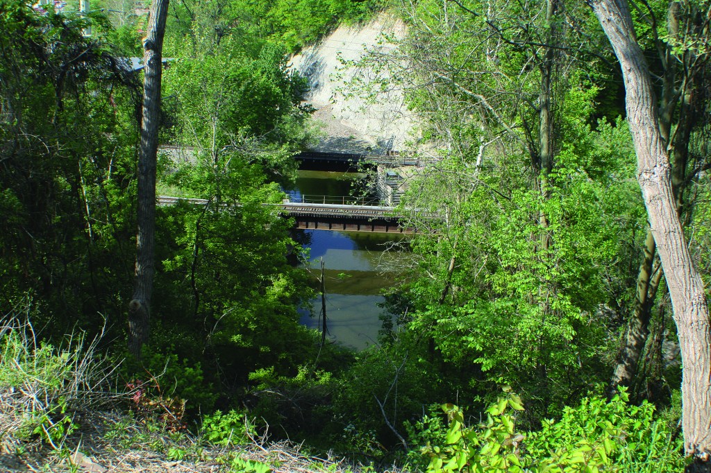 Wednesday, May 19, 2021; Brighton Park, near the trailhead at 4121 Pearl Road: This is a view from an overlook on the trail of a railroad bridge over the Big Creek.