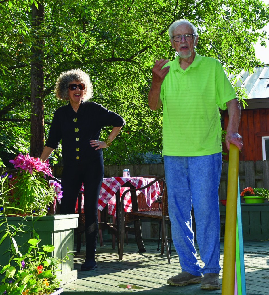 Sunday, June 27, 2021; W. 31st Place, George Hrbek 90th Birthday Sing: Stephanie and George Hrbek step out on their porch. George Hrbek greets friends who came to wish him a happy 90th birthday.