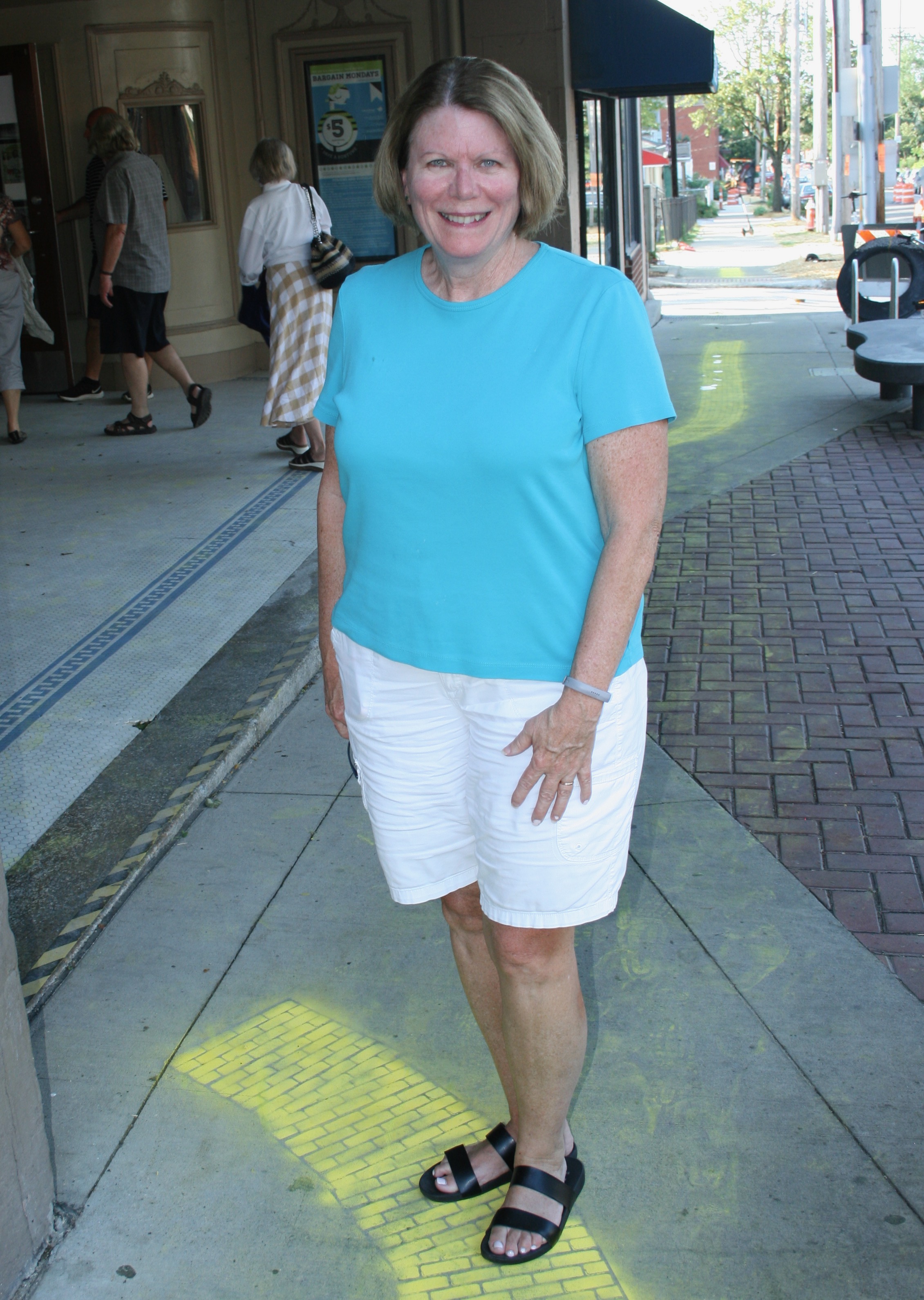 Thursday, August 12, 2021; Capitol Theatre reopening with showing of Wizard of Oz, W. 65th and Detroit Avenue: Maryann Coyne stands on the Yellow Brick Road leading to the Capitol Theatre reopening featuring the Wizard of Oz.
