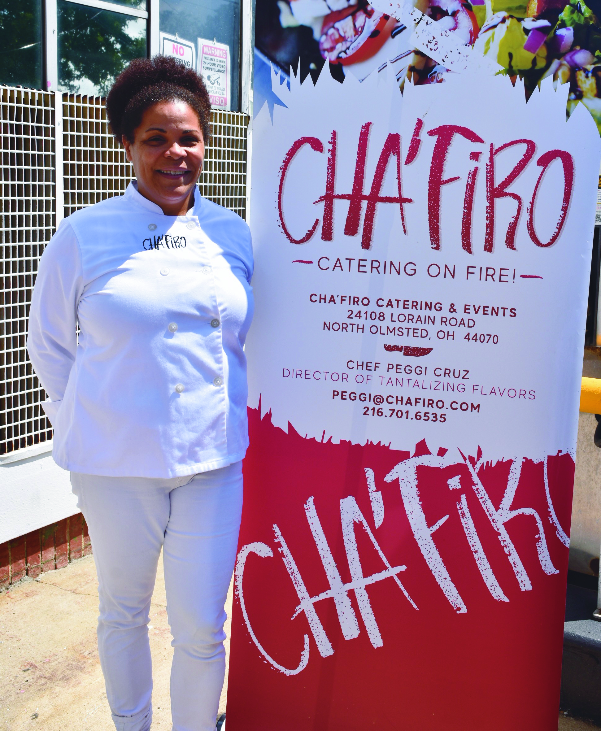 Friday, July 30, 2021; Pop-Up Event to Celebrate Grand Opening of King’s Gas Depot, 3031 Clark Avenue: Chef Peggy Cruz prepares to serve food to guests. Peggy Cruz plans to open her restaurant Cha’Firo at Las Tienditas del Mercado, 2886 W. 25th (W. 25th and Seymour) in September 2021. Allen Moreland Jr., owner of King’s Gas Depot, a full-service station, recruited Cruz for the pop-up event. Hispanic Business Center intern Isaiah Mojica worked to help publicize the event.