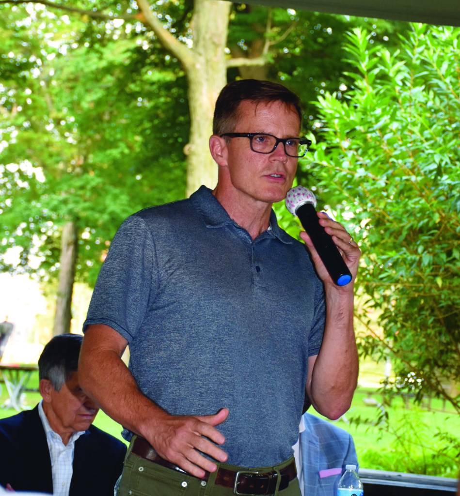 Tuesday, July 27, 2021; The Council of Cleveland Neighborhoods’ Cleveland Mayoral Candidates’ Forum, Edgewater Park upper-level pavilion: Mayoral candidate Kevin Kelley addresses the crowd while answering a question from the moderator.